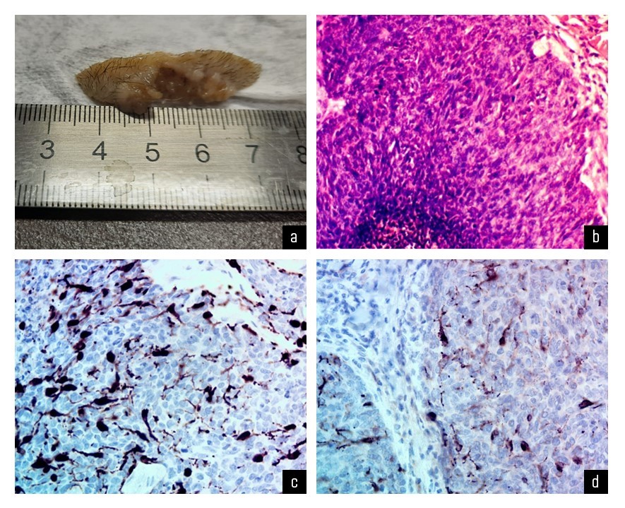 Рис. 6. a — Макроскопическое изображение удаленного образования кожи; б — Базальноклеточная карцинома, гистологический препарат, окраска гематоксилином и эозином, ×200; в — ИГХ с антителом к S100: отмечается диффузная цитоплазматическая экспрессия в резидуальных активированных меланоцитах, ×400; г — ИГХ с антителом к HMB45: отмечается диффузная экспрессия HMB45 в резидуальных активированных меланоцитах, ×400