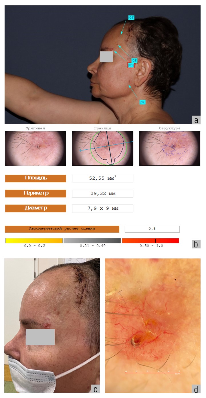 Fig. 7. A macro photograph of the patient when mapping the skin in the lateral projection on the left: a — a red square [01] with an arrow indicates a suspicious skin formation No. 1 on the left side of the face in the temple area; б — assessment of the malignancy of skin formation No. 1 by artificial intelligence is 0.8; в — macro-image of suspicious skin formation No. 1; г — dermatoscopic image of suspicious skin formation No. 1: convoluted tree-like vessels were found, ulceration in the center of the formation, the borders are fuzzy, the edges are raised