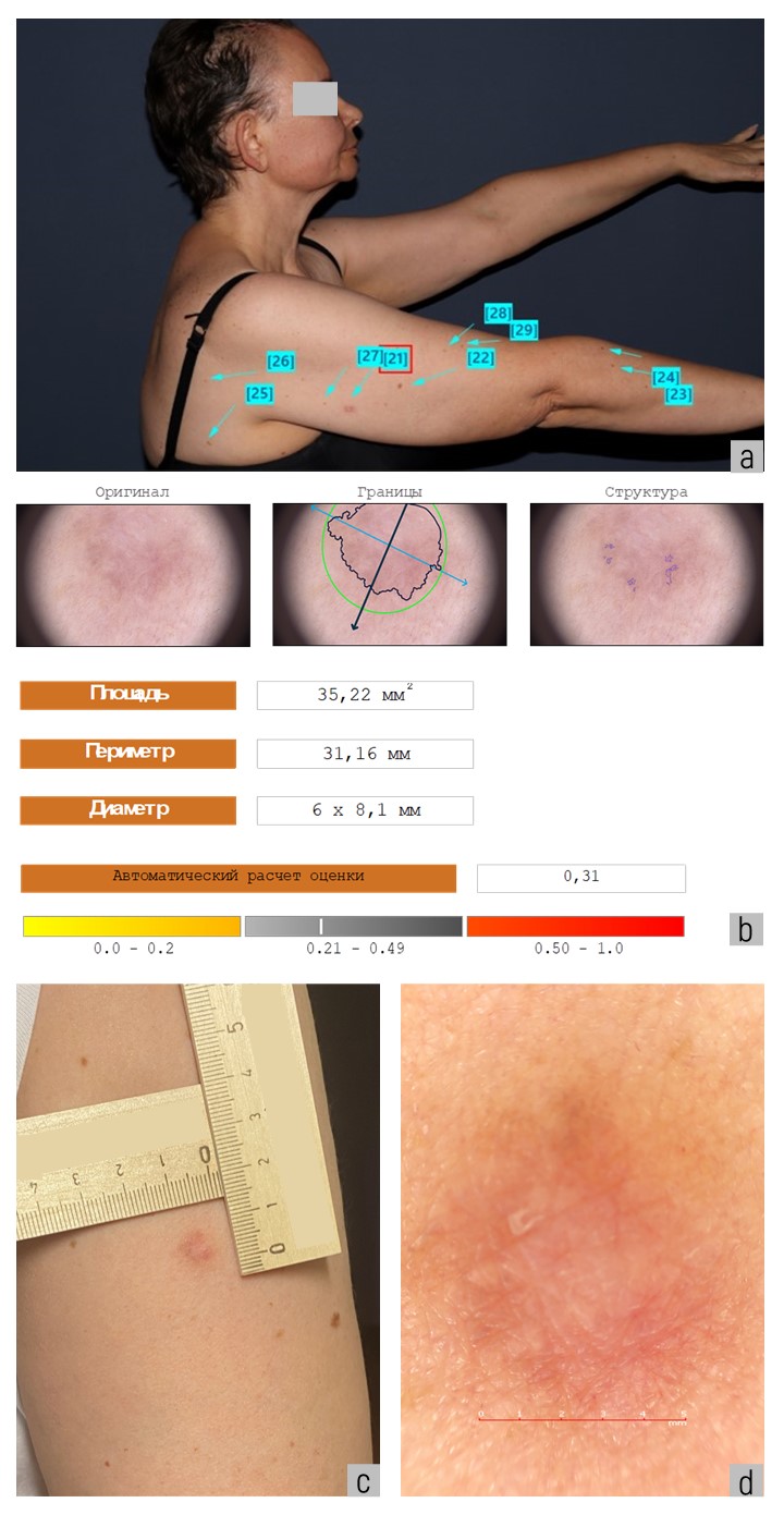 Рис. 8. Макроснимок пациентки при картировании кожи в боковой проекции справа: a — красным квадратом (маркером) [21] со стрелкой обозначено образование кожи правой руки № 21; б — оценка злокачественности образования кожи № 21 искусственным интеллектом равна 0,31 (сомнительное образование); в — макроснимок образования кожи № 21; г — дерматоскопическое изображение образования кожи № 21: бесструктурное пятно светло-коричневого цвета с небольшим разряжением пигмента и регрессом в центре, симметричное по двум осям, с размытостью границ