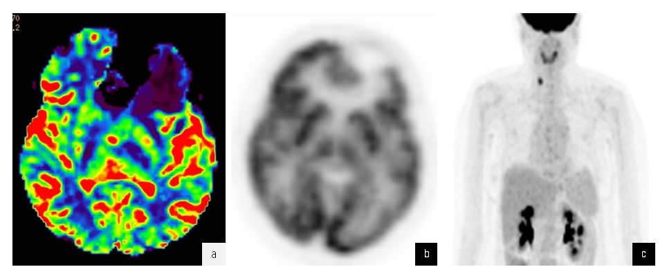 Рис. 9. a — карта МР-перфузии CBV: отмечается обширная зона гипоперфузии в зоне удаленной опухоли и снижение показателей в зоне отека; б — ПЭТ изображение в аксиальной проекции с 18F-ФДГ: данные коррелируют с МР-перфузией; в — на ПЭТ изображении всего тела 18F-ФДГ выявляется очаг повышенной аккумуляции радиофармацевтического препарата в проекции правой доли щитовидной железы