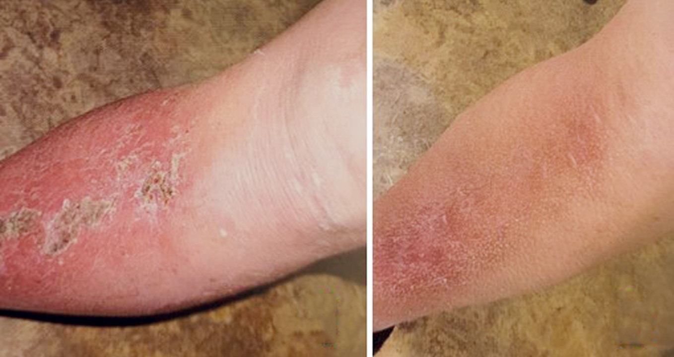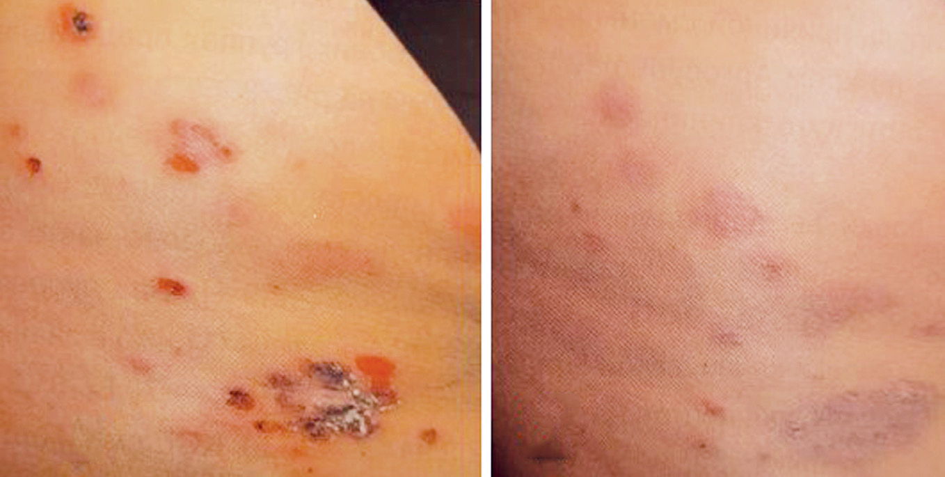 Пациентам с хроническими дерматозами (атопическим дерматитом, экземой), осложненными бактериальной инфекцией, и осложнениями после укуса насекомых на фоне системной терапии (антигистаминные препараты второго поколения) назначалась комбинация ФК и гидрокортизона в виде крема (Фуцидин® Г). Пациенты наносили препарат на пораженные участи тонким слоем 3 раза/день. Полный регресс гнойных элементов наблюдался у 46% пациентов на 5–6-й день от начала терапии; у 22% — на 7–8-й день; у 32% — на 12–14-й день (рис. 1–3). Все пациенты данной группы отмечали снижение зуда и в целом улучшение основного патологического процесса.