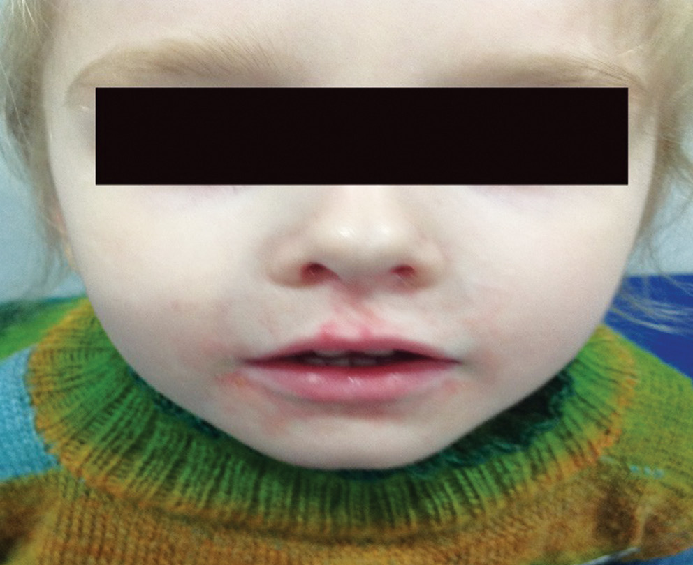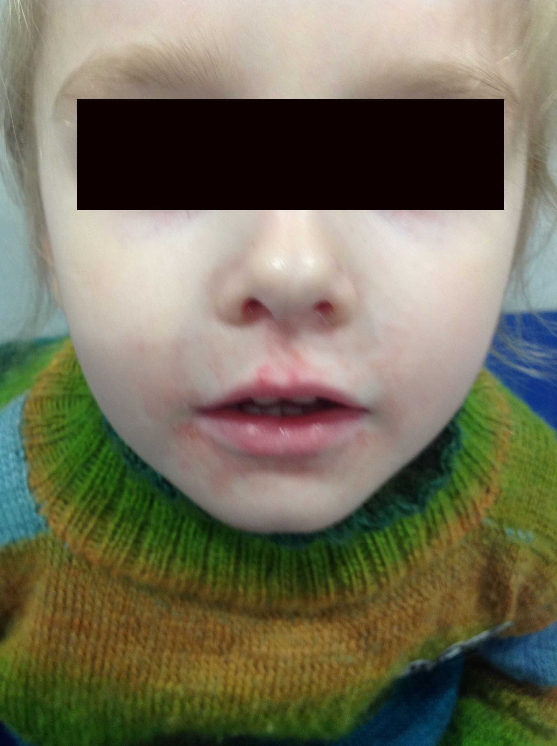 Под наблюдением находилась пациентка 6 лет. При первичном обращении в феврале 2020 г. жалобы на высыпания вокруг рта, крыльев носа. Пациентка отмечает, что после контакта с водой и посещения бассейна резко усиливается покраснение, появляется зуд. Из анамнеза известно, что данный процесс существует около 2 месяцев. Также известно, что ребенок страдает атопическим дерматитом с 1 года, процесс протекает достаточно легко, обострения — не чаще 2 раз в год.
