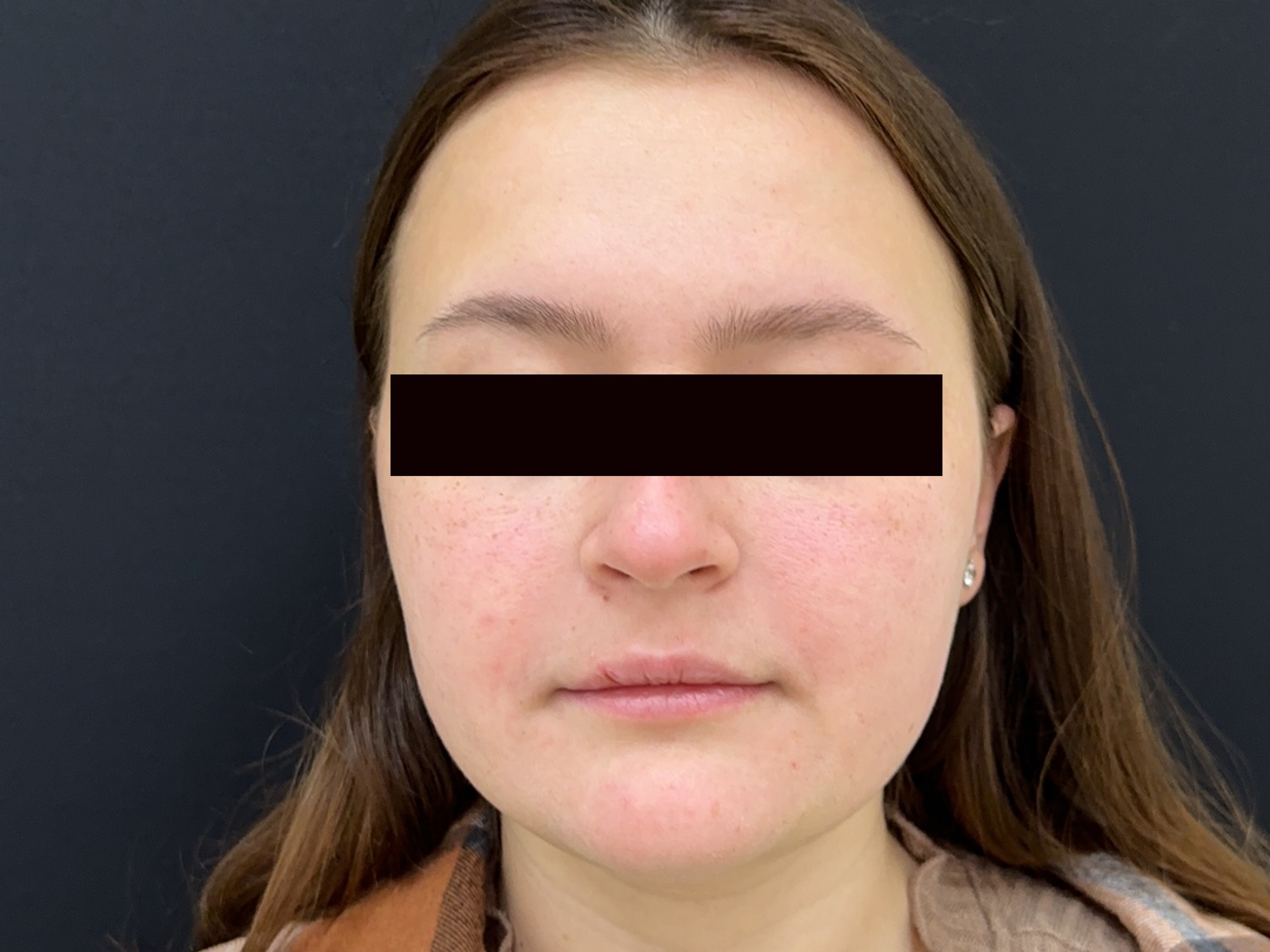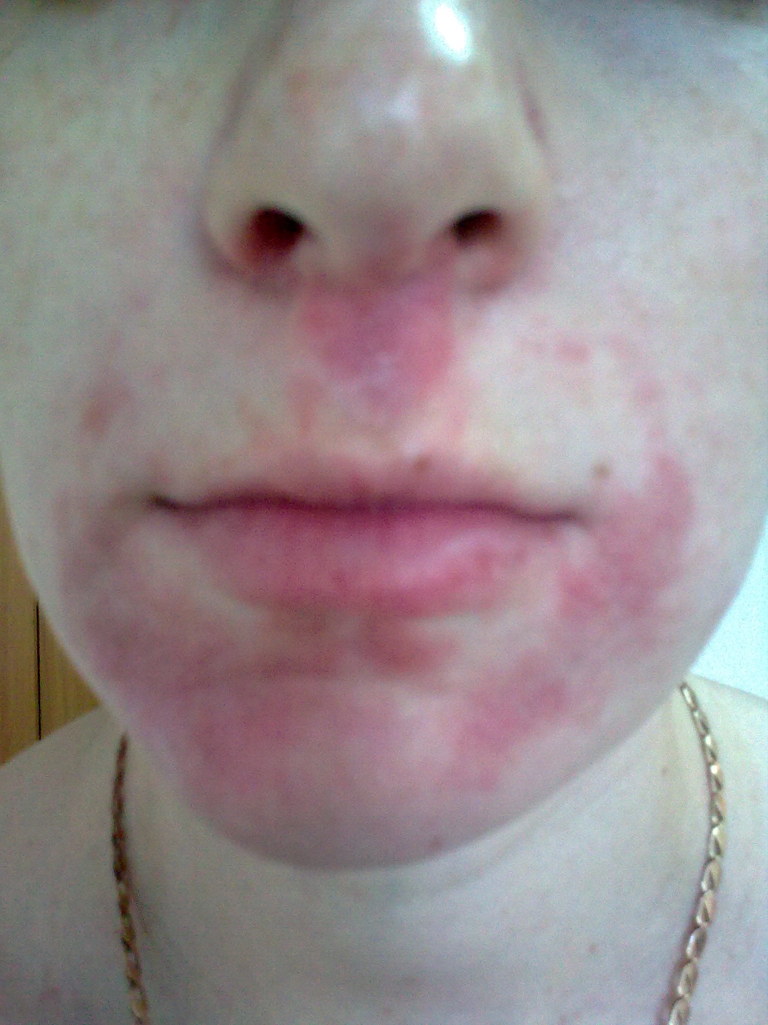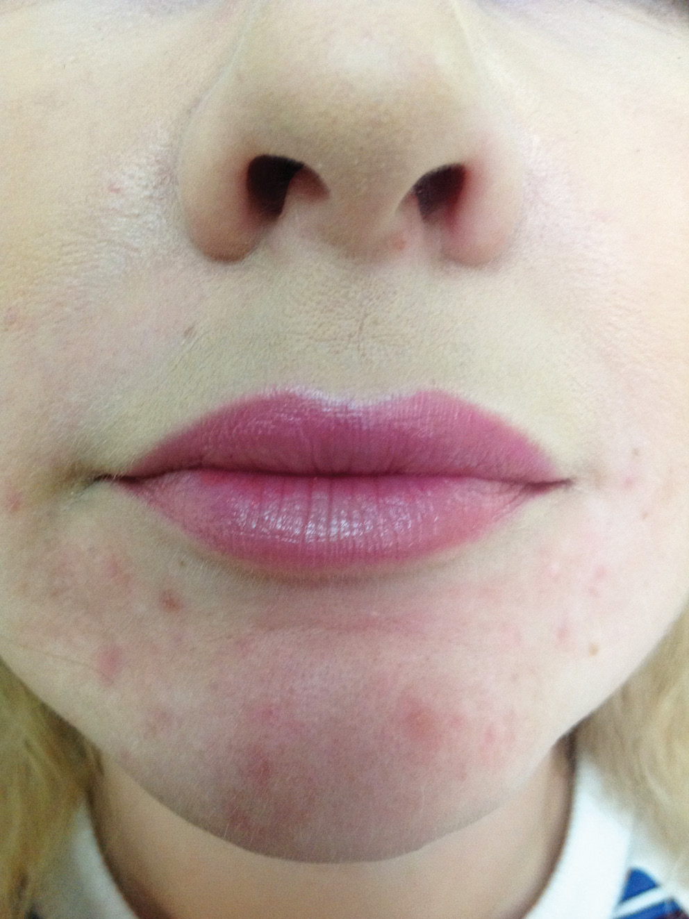 При объективном осмотре: кожный процесс имеет распространенный характер и локализован преимущественно в периоральной области. Представлен эритематозно-сквамозными очагами с нечеткими границами, сгруппированными ярко-красными папулами 0,1–0,2 см. Процесс носит симметричный характер.