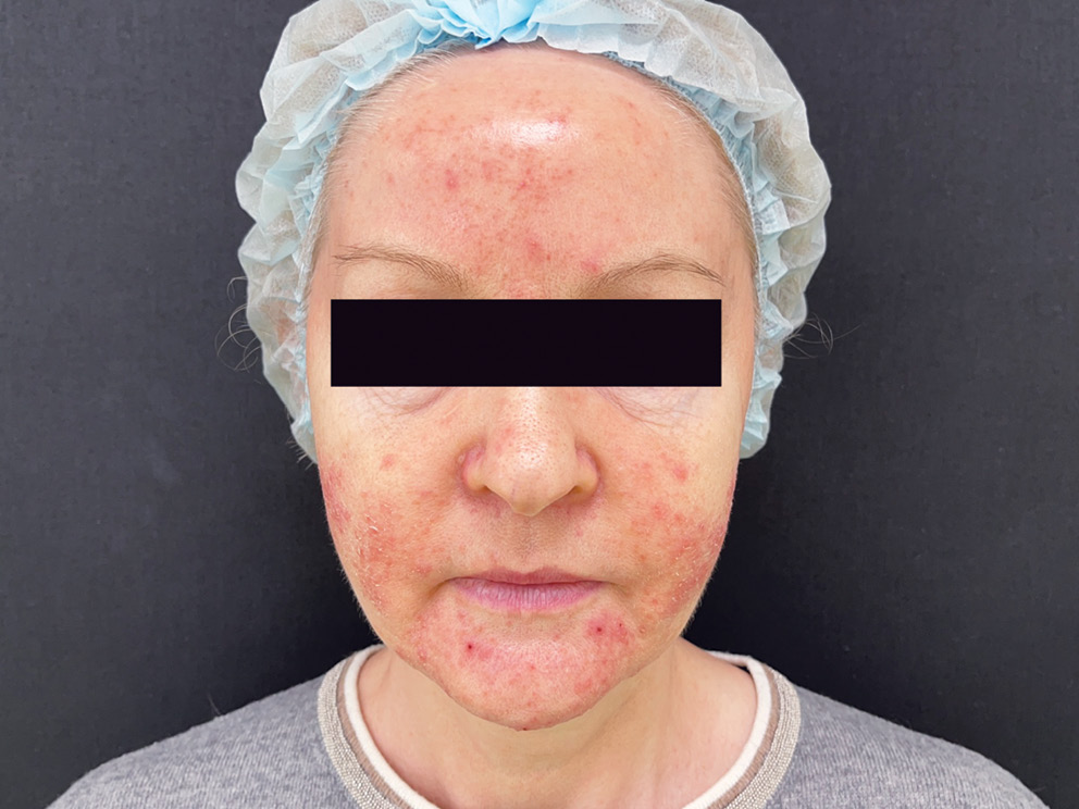 Под наблюдением находится пациентка 52 лет с жалобами на распространенные высыпания на коже лица, покраснение и чувство жжения в течение последних 5 месяцев. Двенадцать месяцев назад наступила менопауза. Заместительную гормональную терапию не принимает. Шесть месяцев назад в связи со стрессовой ситуацией отмечает обострение течения бронхиальной астмы. Для купирования приступов был назначен ингаляционный глюкокортикостероид.