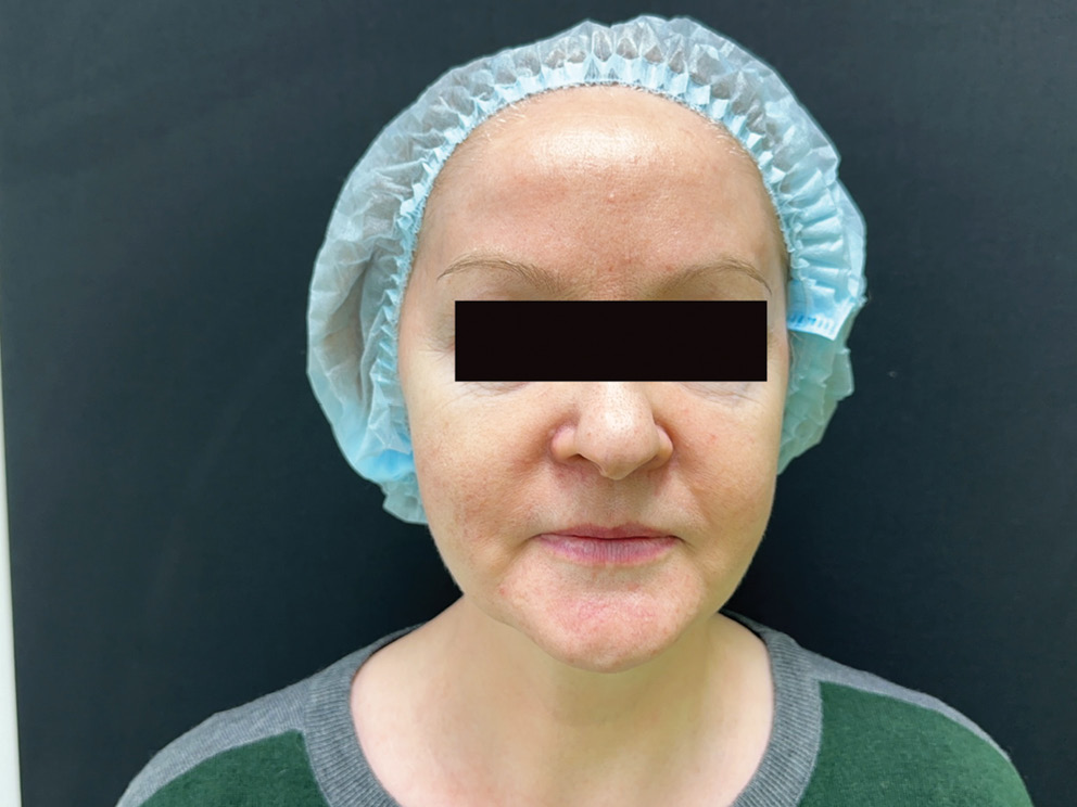 В течение первых 8–10 дней положительная динамика минимальна, начиная со 2-й недели отмечено улучшение. На контрольном визите через 1 месяц патологический процесс представлен умеренной эритемой, единичными папулами размером до 0,1–0,2 см (рис. 4).