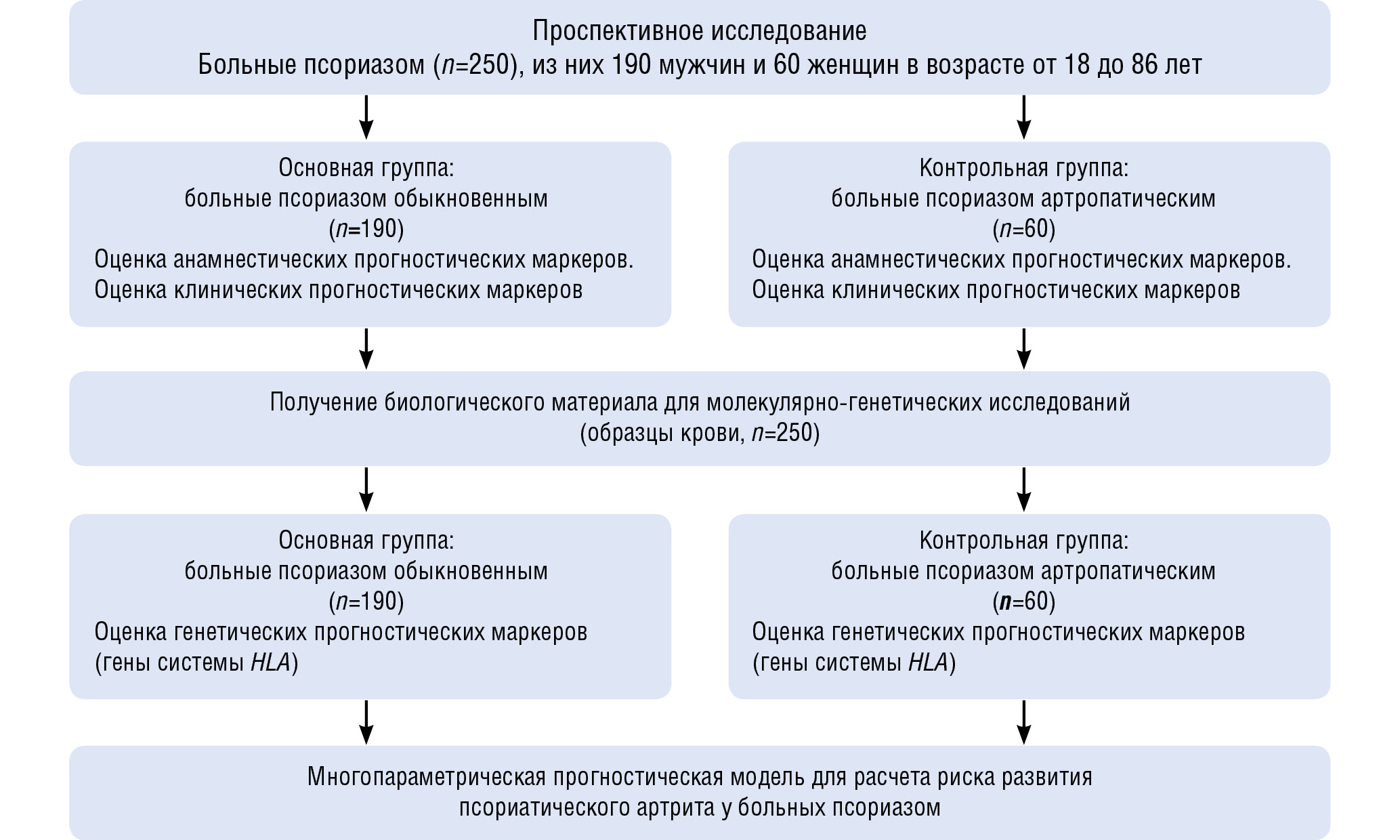 Анализ прогностической значимости клинико- анамнестических и генетических маркеров в развитии поражения суставов у больных псориазом проводился на выборке из 250 больных. Основную группу составили больные с установленным диагнозом псориаза обыкновенного (n = 190), контрольную группу — больные псориазом артропатическим (n = 60).