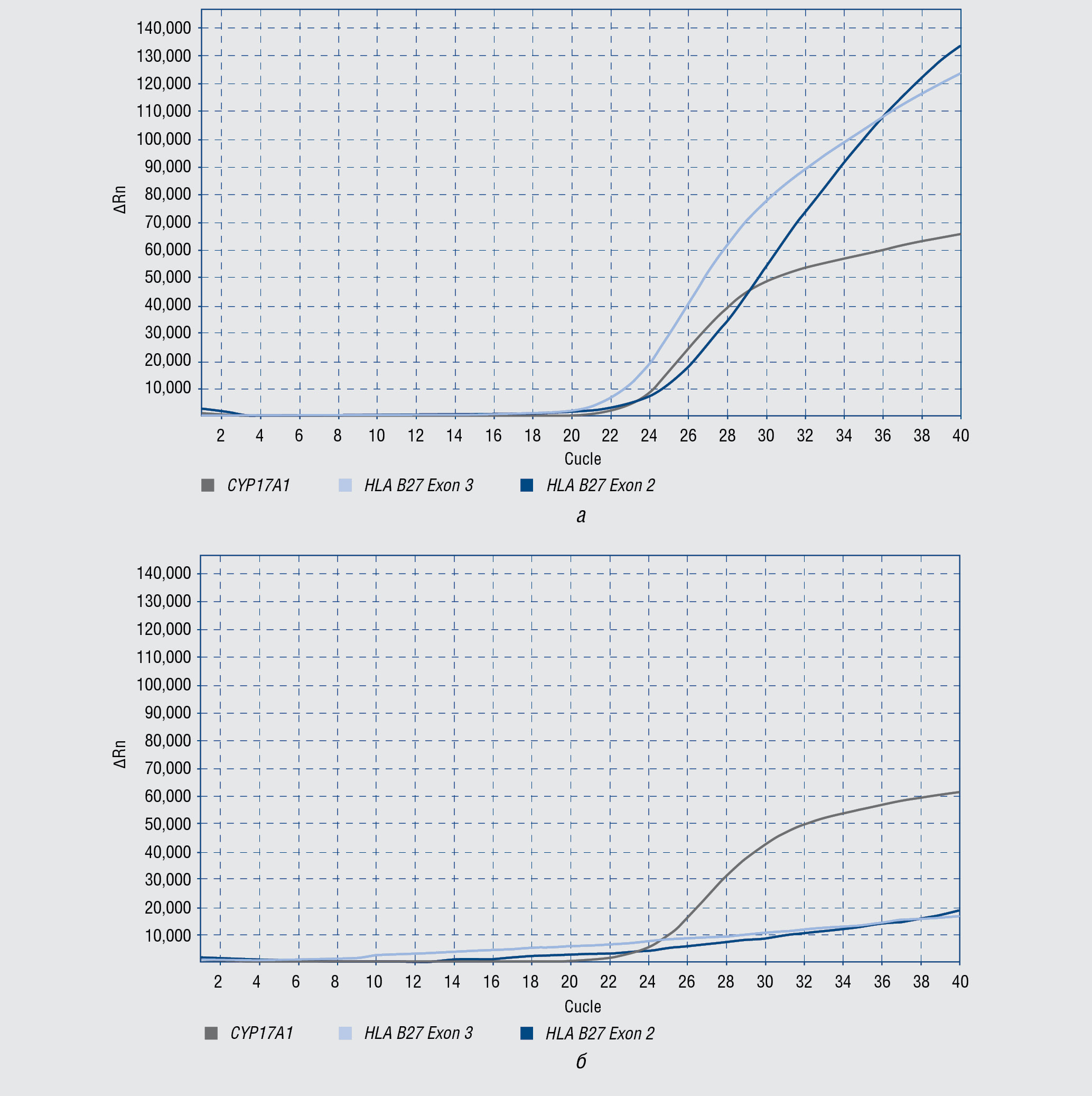 Рис. 2. Анализ результатов исследования ДНК человека методом ПЦР в реальном времени для аллель-специфичной амплификации HLA-B27: а — обнаружен аллельный вариант HLA-B27 (графики роста флуоресценции аллель-специфичных гидролизующихся проб показаны голубым и синим); б — аллельный вариант HLA-B27 не детектирован (только график роста флуоресценции контрольной реакции гена CYP17A1, обозначен серым)