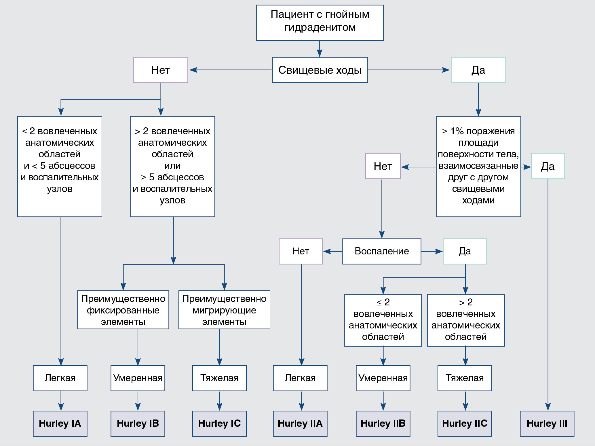 Примечание. Соответствие баллов степеням тяжести гнойного гидраденита: легкая — 0–7; средняя — 8–12; тяжелая — ≥ 13.