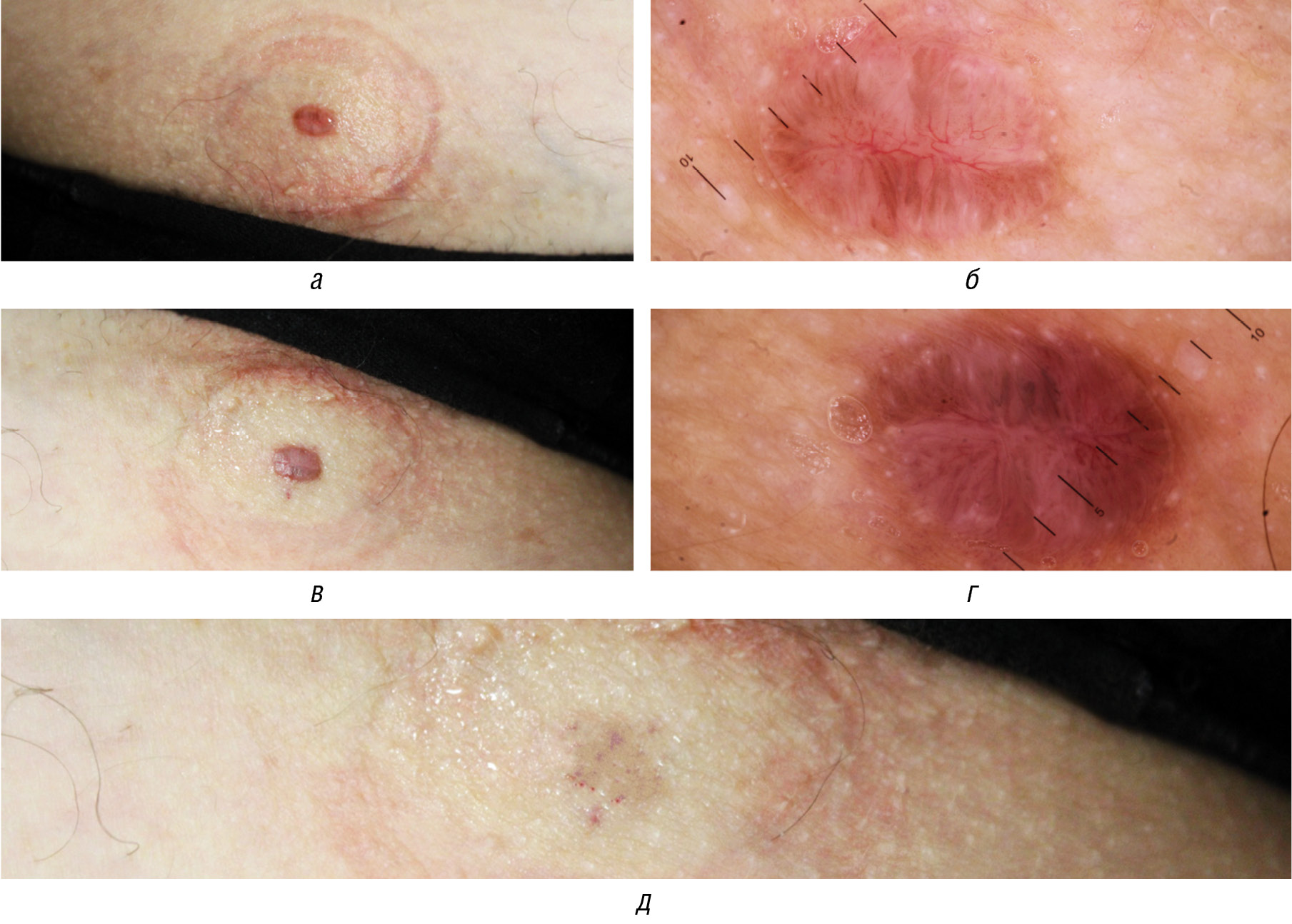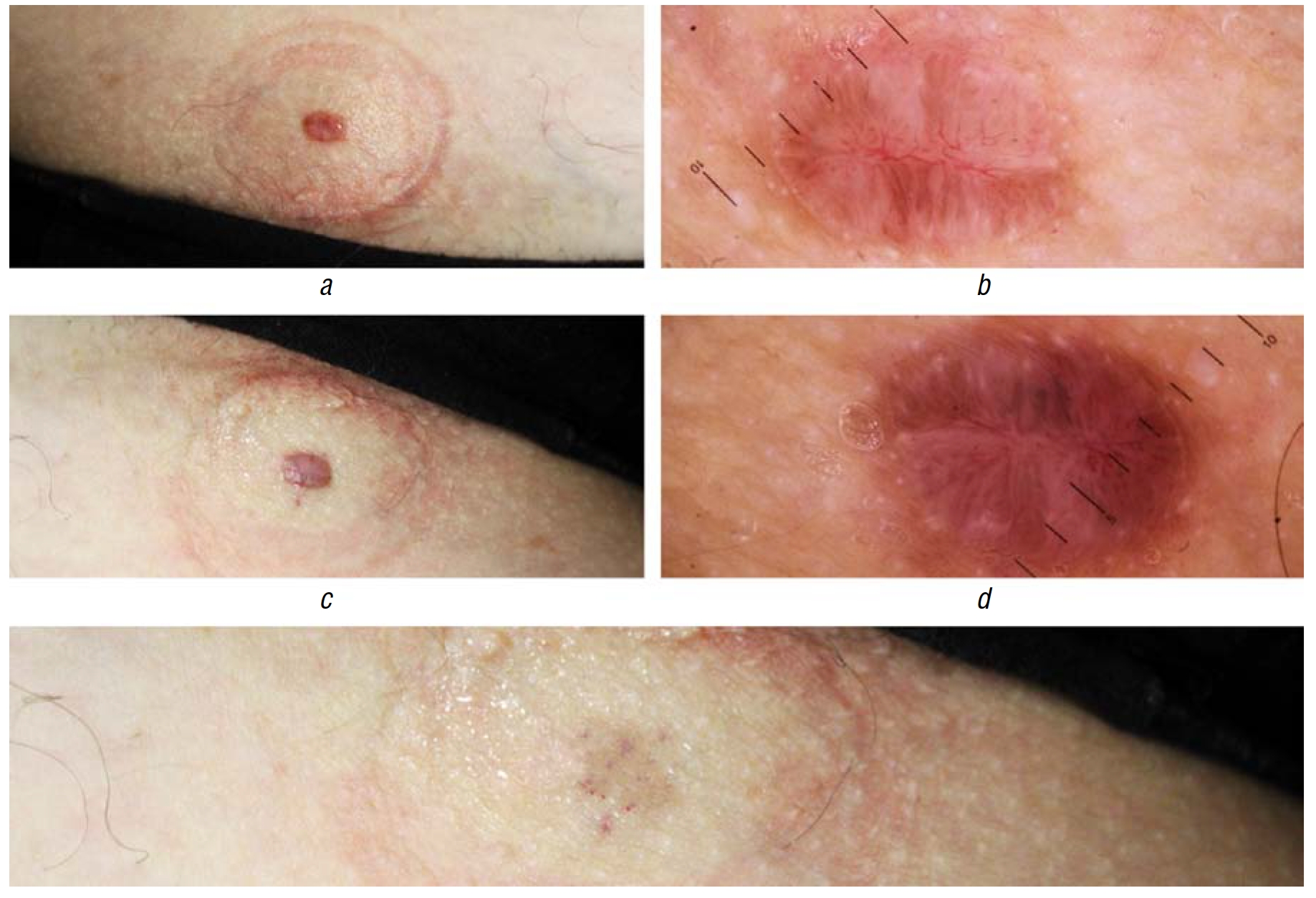 Рис. 1. Динамика клинической и дерматоскопической картины при лечении нодулярной формы базальноклеточной карциномы в процессе лечения: a, b — до лечения; c, d — сразу после процедуры; e — через 1 месяц после лечения