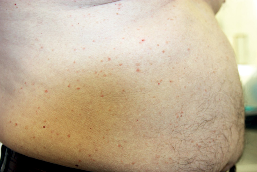 Рис. 1. Диссеминированные папуло-везикулезные высыпания в области живота