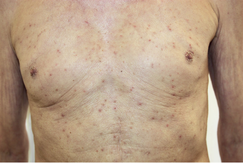 В дальнейшем клиническая картина дерматоза становится более понятной и характеризуется появлением у пациентов мономорфных высыпаний в виде округлых зудящих папул и везикул с локализацией в области груди, спины, верхних конечностей, бедер (рис. 1–3). Количество элементов может варьировать от единичных до нескольких десятков. Высыпания не имеют тенденции к периферическому росту и слиянию и могут быть экскориированы вследствие сильного зуда. Размер обычно составляет 1–3 мм, но может достигать 1 см в диаметре. По данным литературы, дерматоз наблюдается в основном у мужчин старше 40 лет с I и II фенотипами кожи [3, 4].