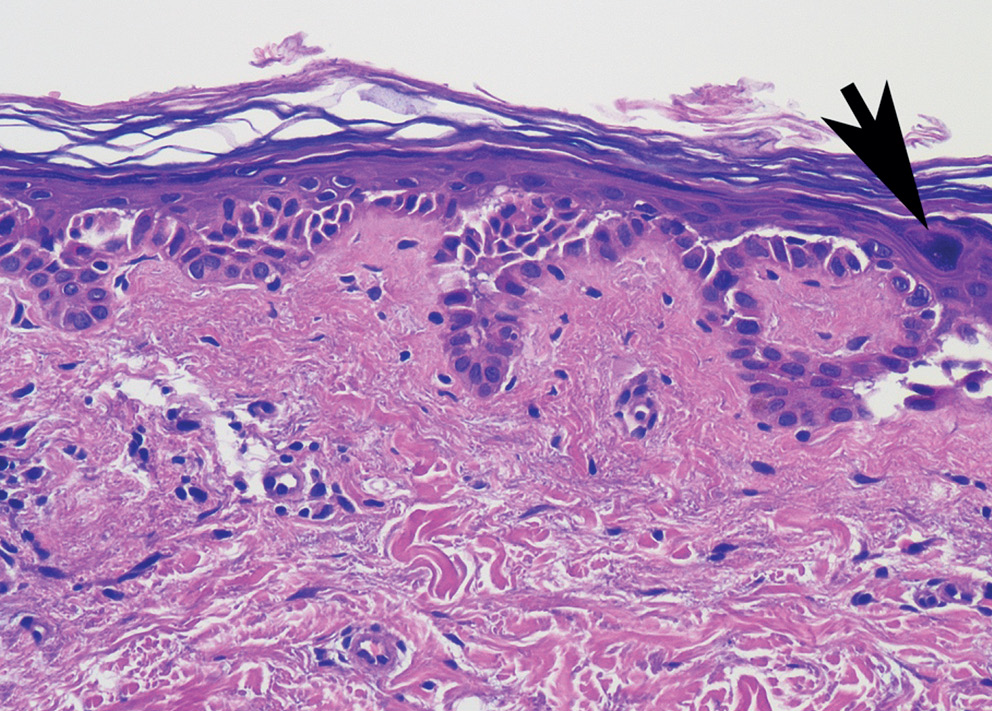 Рис. 5. Пемфигус-подобный вариант болезни Гровера: супрабазальный акантолиз с образованием щелей в эпидермисе. Видна крупная дикератотичная клетка (стрелка)