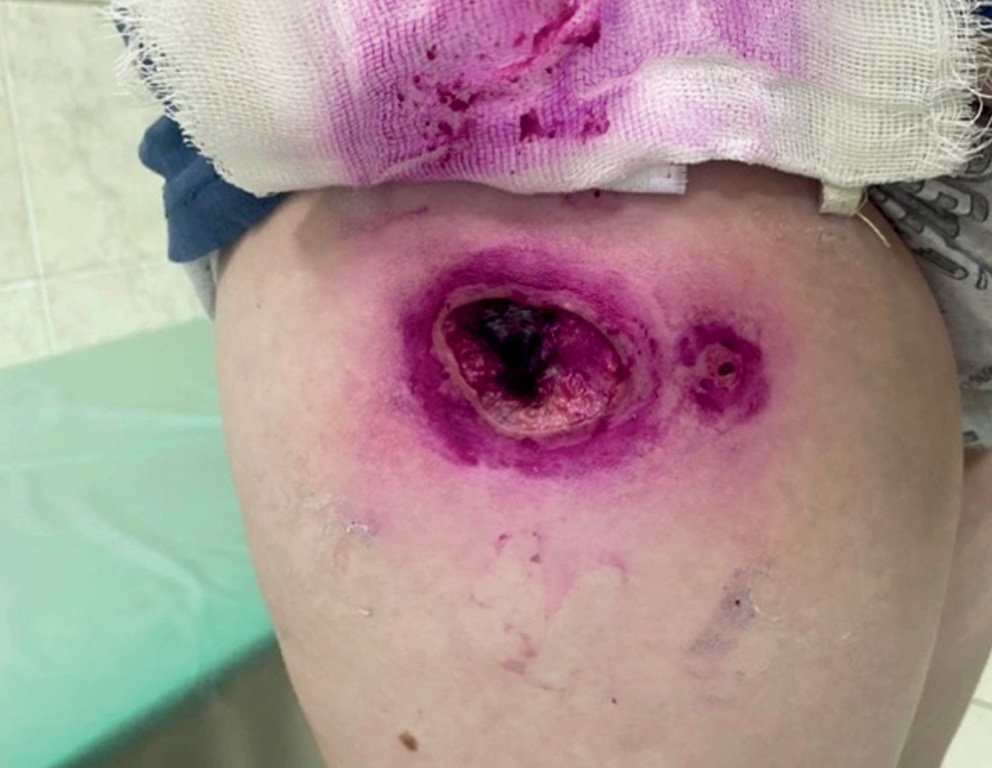 Рис. 2. В области верхней трети правого бедра пациента определялись язвы диаметром 1,5 и 5 см, образовавшиеся на месте плотных узлов