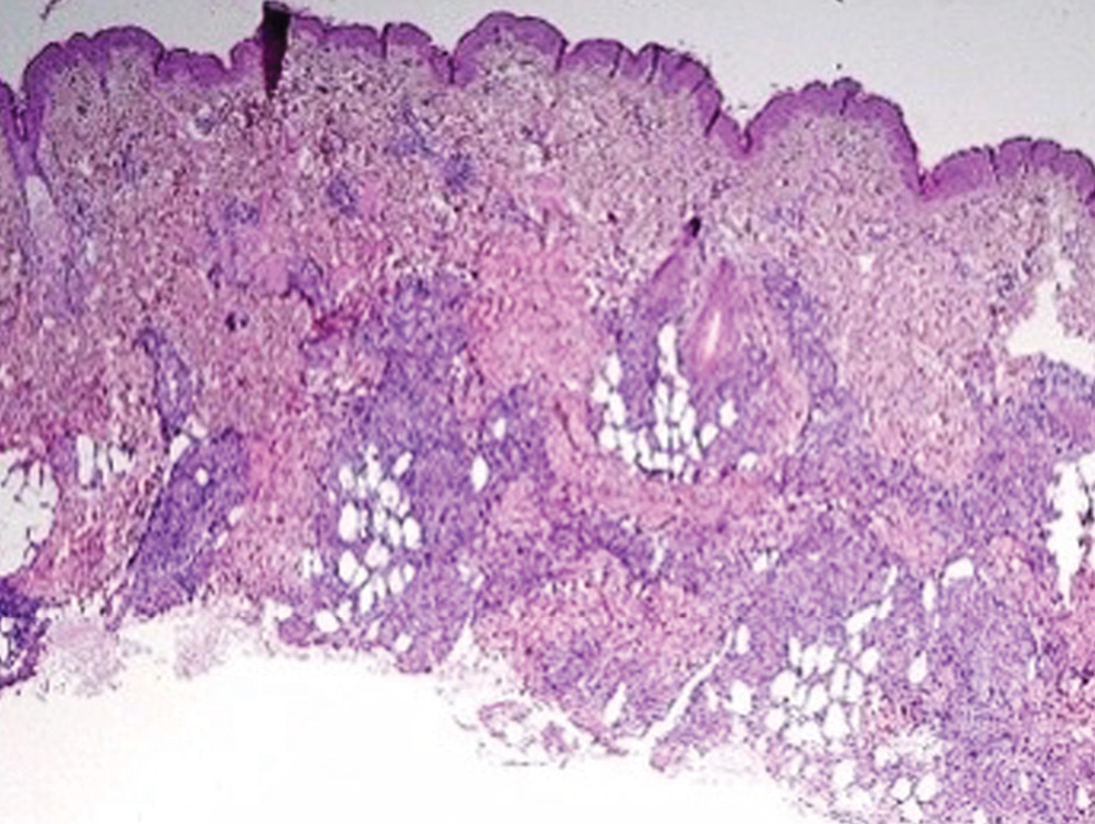 Рис. 3. Микрофотография, ×40, гематоксилин-эозин. В дерме определяются плотные крупноочаговые инфильтраты, расположенные преимущественно в средних и глубоких отделах дермы и проникающие в дольки подкожной жировой клетчатки