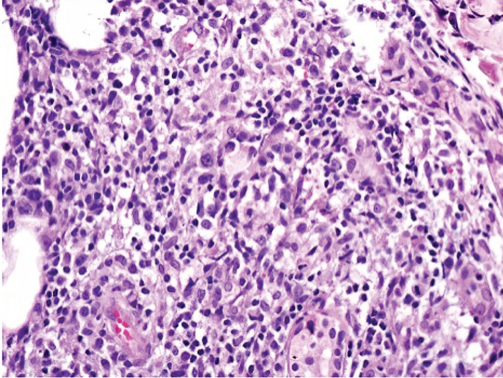 Рис. 4. Микрофотография, ×100, гематоксилин-эозин. Дермальные инфильтраты, представленные крупными лимфоидными клетками с иммунобласто- и центробластоподобной морфологией и малыми лимфоцитами