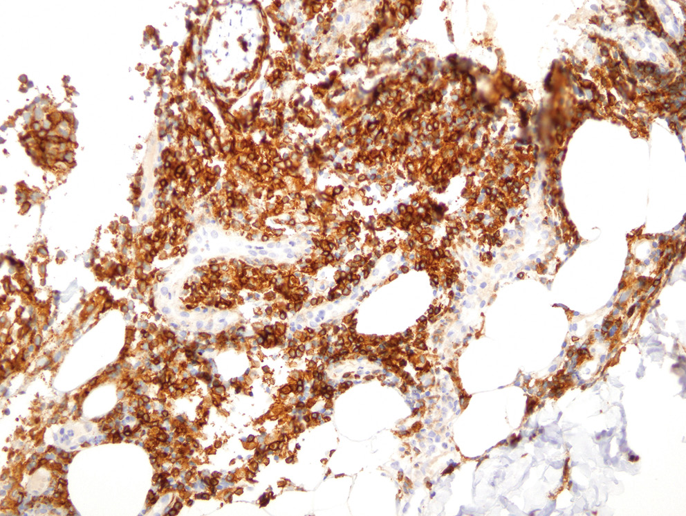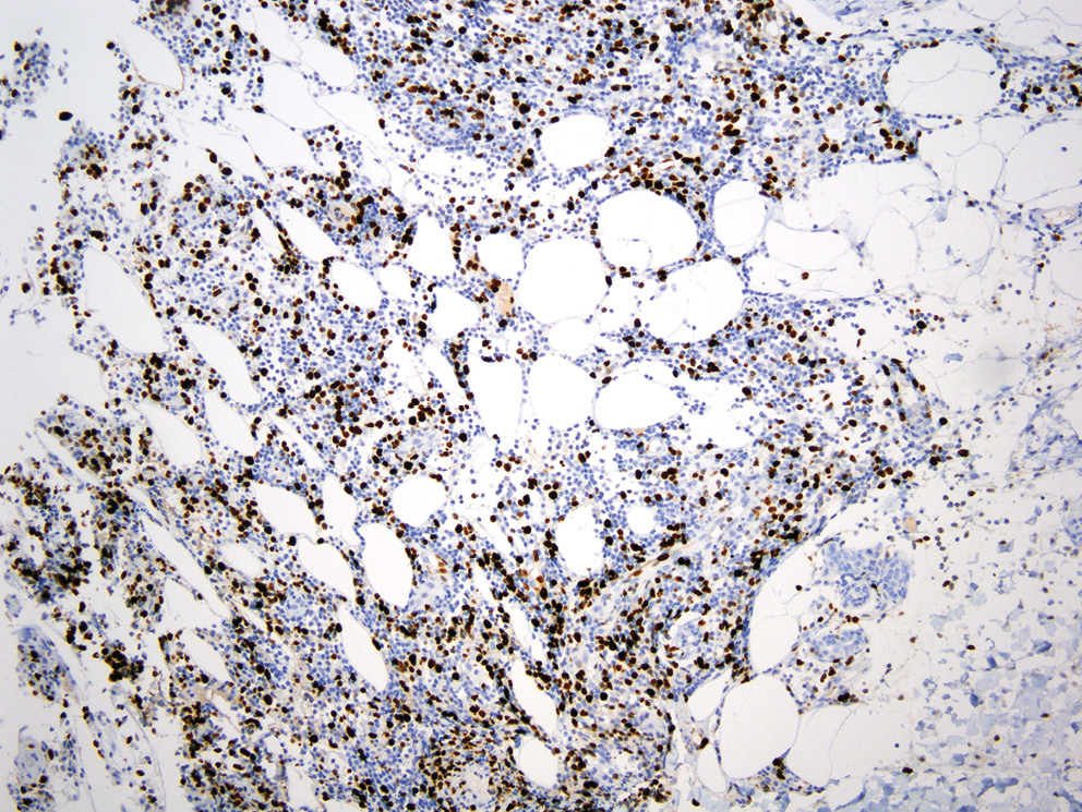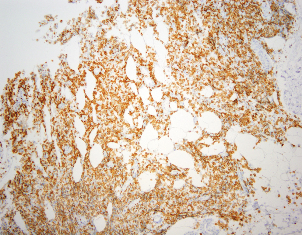 Рис. 5. Микрофотография, ×40, иммуногистохимическое исследование с применением антител к CD3. Определяется выраженная положительная экспрессия CD3 крупными лимфоидными клетками инфильтрата