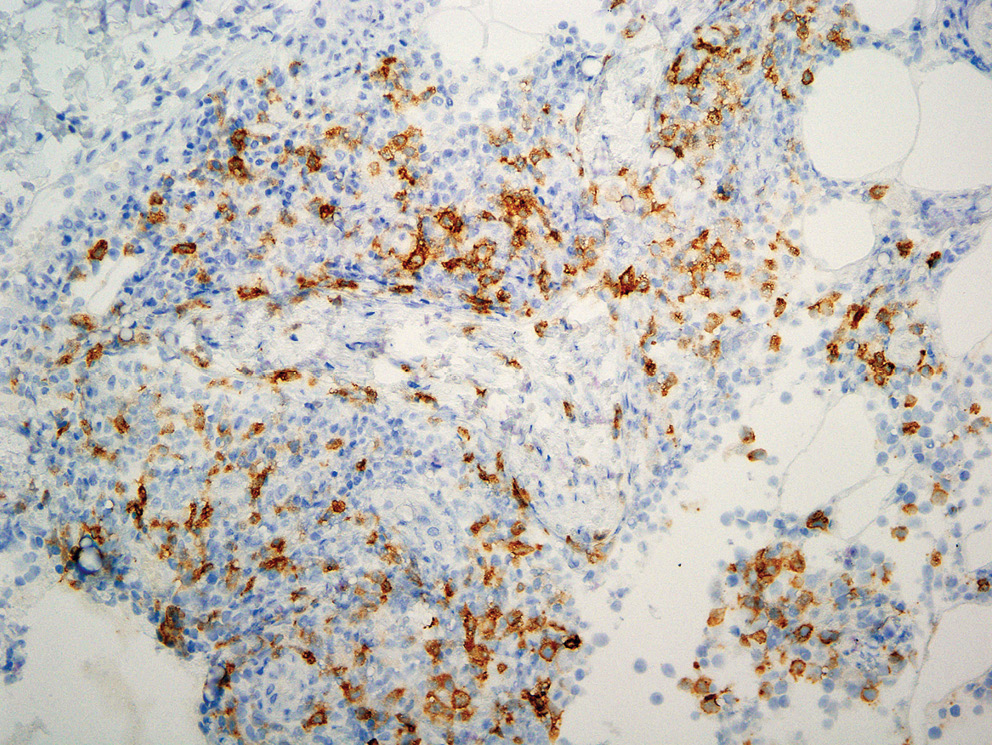 Рис. 6. Микрофотография, ×40, иммуногистохимическое исследование с использованием антител к CD4. Определяется выраженная положительная экспрессия CD4 крупными лимфоидыми клетками инфильтрата