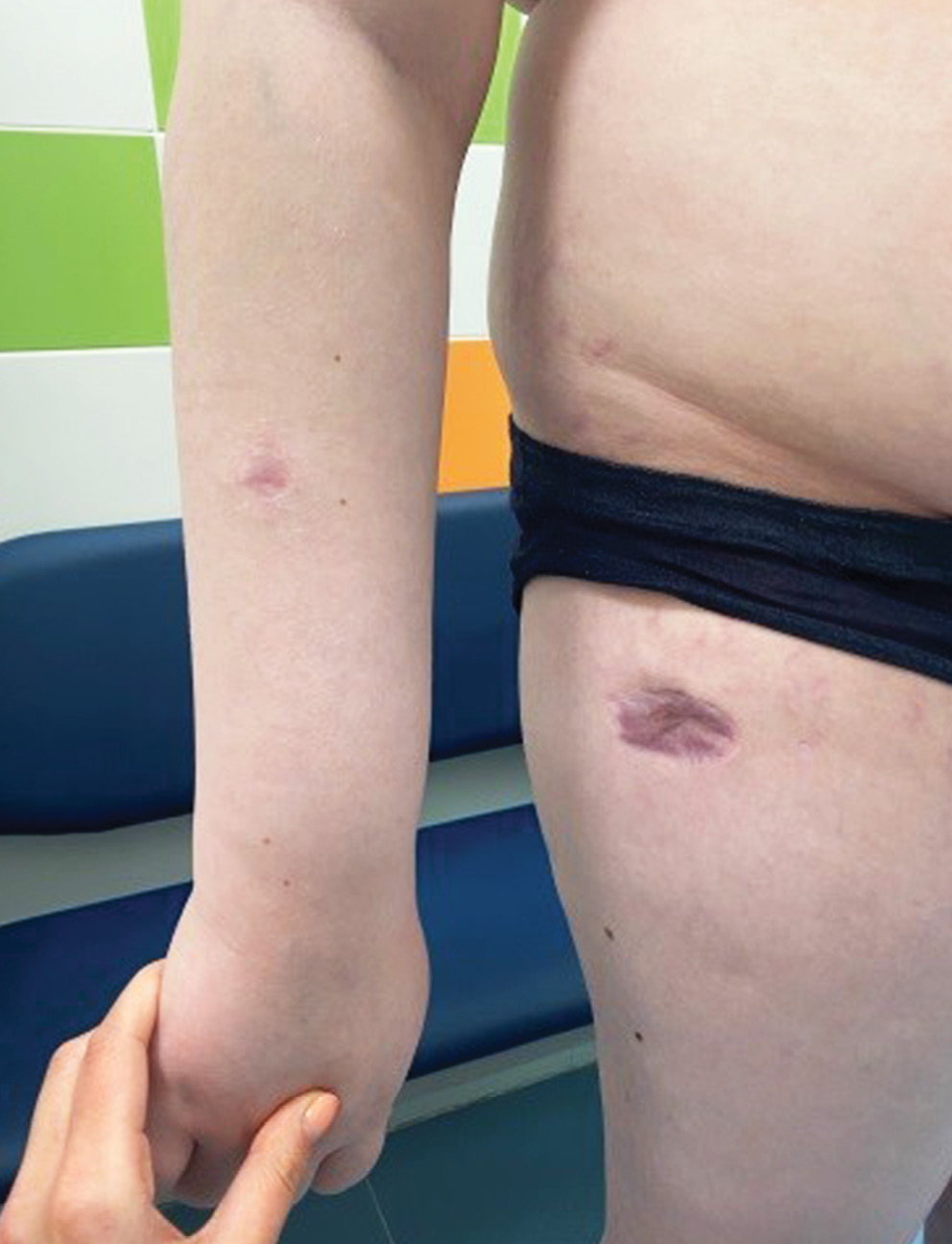 В октябре 2022 г. в кожно-венерологическое отделение ФГБОУ ВО СПБГПМУ поступил пациент Ч. 10 лет с жалобами на язвенные образования на коже в области нижних конечностей. Из анамнеза известно, что мальчик заболел осенью 2021 г., когда впервые отметил появление высыпаний в виде «красноватых пятен», которые с течением времени разрешались. Весной 2022 г. высыпания полностью разрешились, летом появились вновь. Со слов матери, у ребенка отмечались периодические боли в животе. В августе 2022 г. мальчик переболел новой коронавирусной инфекцией. Осенью в области правого бедра у пациента появилось растущее в диаметре уплотнение, кожа над ним была гиперемирована. При обращении к дерматологу по месту жительства высыпания пациента были расценены как инфекция кожи и подкожно-жировой клетчатки, поэтому ему была назначена системная и топическая антибиотикотерапия (амоксициллин, обработка очагов поражения фукорцином, фуцидином и ихтиоловой мазью). На фоне проводимой терапии не было получено клинического эффекта, поэтому в последующем мальчик был госпитализирован в Санкт-Петербургский государственный педиатрический медицинский университет.
