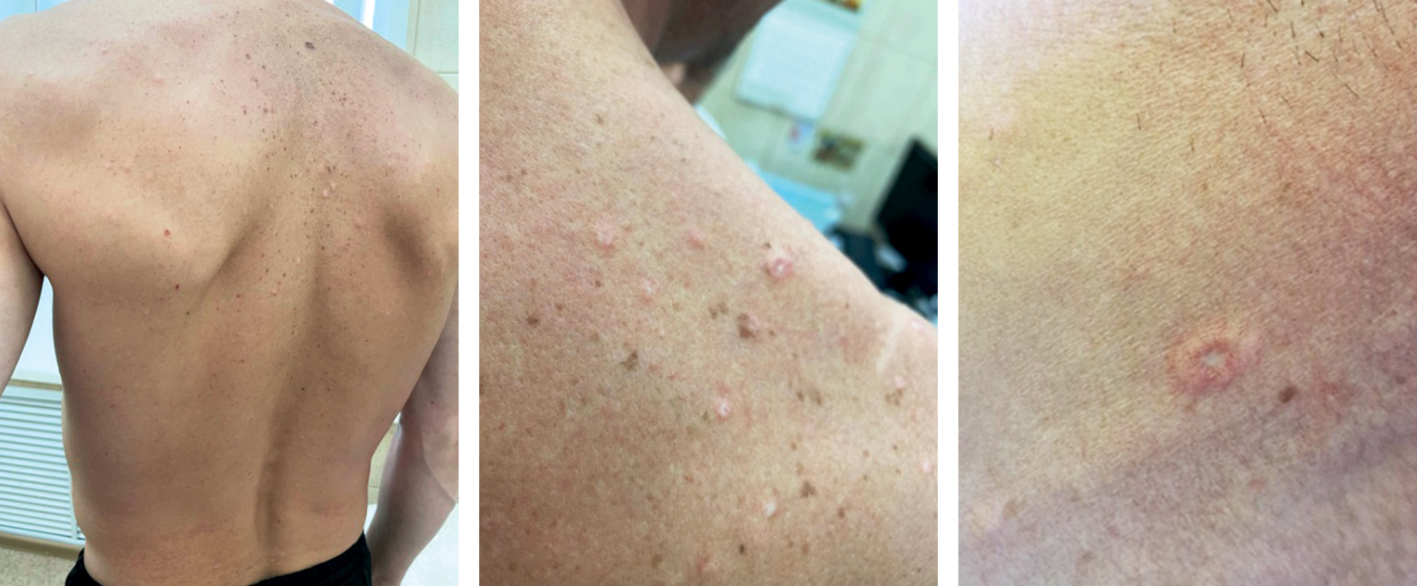 Доброкачественная кожная форма клинически представлена эритематозными папулами диаметром 2–15 мм с телеангиэктатической эритематозной каймой и вдавленным фарфорово-белым или белесоватым центром, представляющим собой атрофический рубец [3, 7]. Наблюдается следующая эволюция кожных высыпаний, впервые описанная Дегосом: первичные неспецифичные эритематозные папулы, сопровождающиеся ощущением легкого жжения, в течение нескольких недель прогрессируют до плоских фарфорово-белых рубцов, имеющих вид элементов после перенесенной ветряной оспы и окруженных эритематозным ободком [2, 4, 6, 13]. Типичной локализацией сыпи являются туловище и конечности, в то время как ладонно-подошвенные области, лицо, волосистая часть головы и гениталии обычно остаются интактными [7].