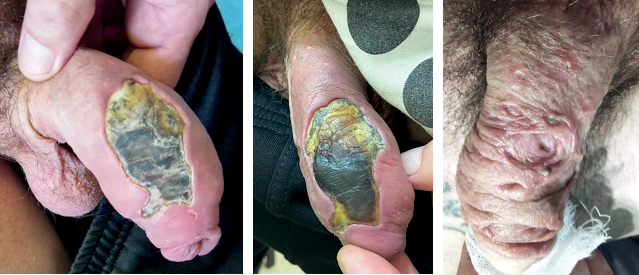 Fig. 2. Degos disease: а, б — erosive and ulcerative lesions of the penis, covered with a yellowish-gray crust; в — in the healing stage