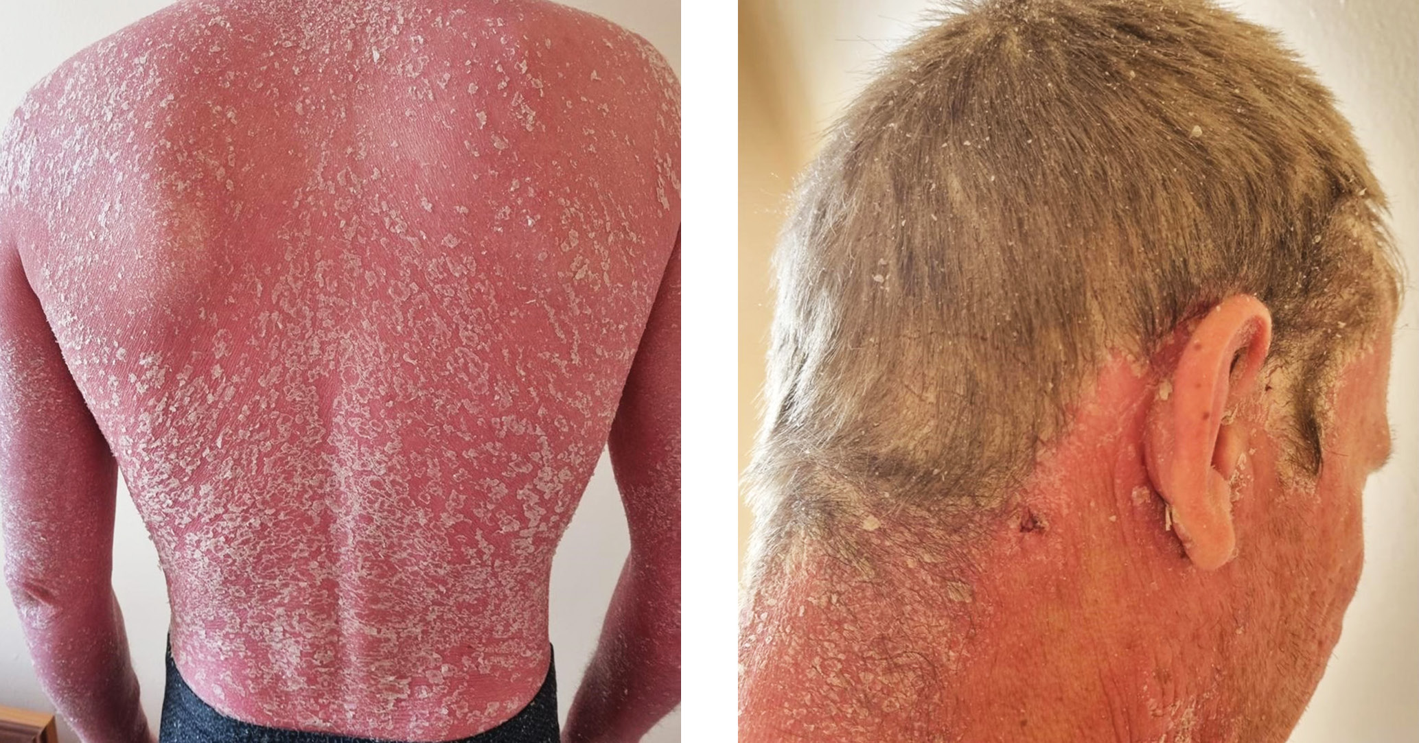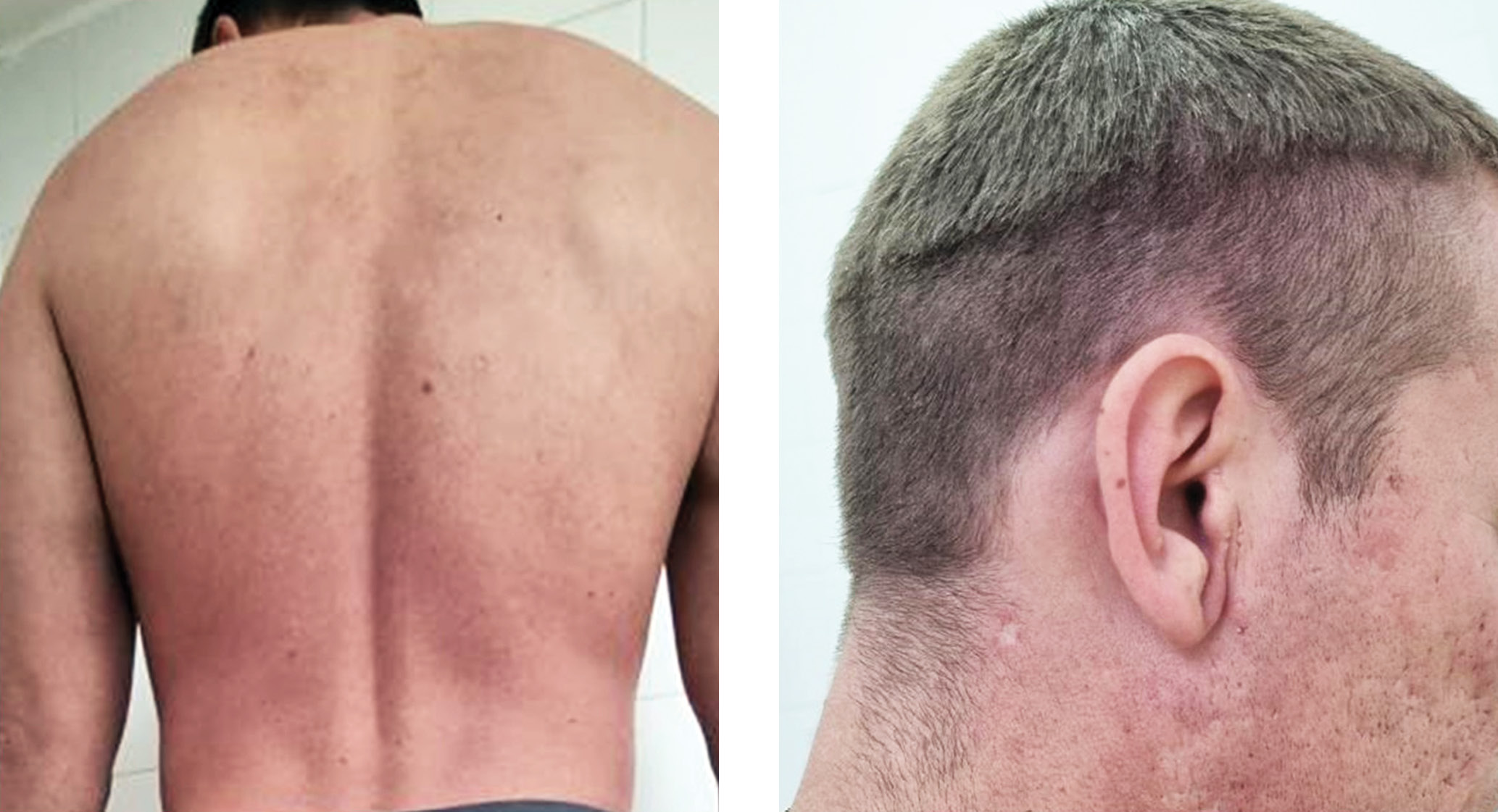Местный статус (Status localis) на момент первичного обращения (рис. 1): в патологический процесс вовлечено около 90% кожного покрова. Кожа ярко-красного цвета, инфильтрирована, отечна, отмечаются участки лихенификации. Кожа покрыта большим количеством чешуек и чешуйко-корок (мелко- и крупнопластинчатое шелушение). На коже волосистой части головы — очаги алопеции и диффузного разрежения волос. На этом фоне четко выявляется обширная инфильтрация, подчеркнут фолликулярный аппарат, чешуйко-корки. Поражение ногтевых пластин представлено онихомадезисом, онихолизисом, лейконихией, продольными гребнями.