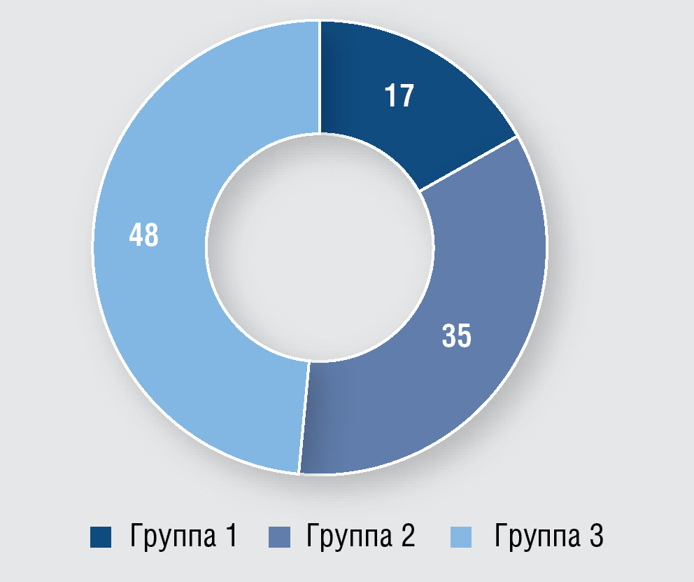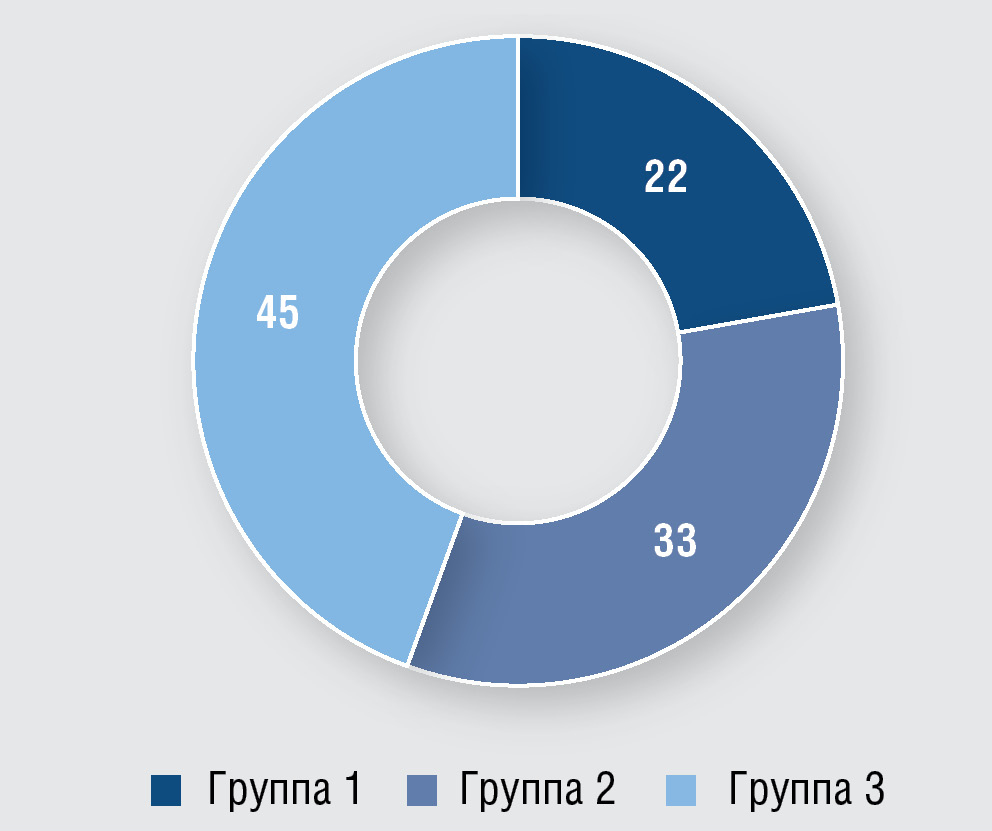 Рис. 1. Частота встречаемости M. furfur на коже лица групп 1–3, %