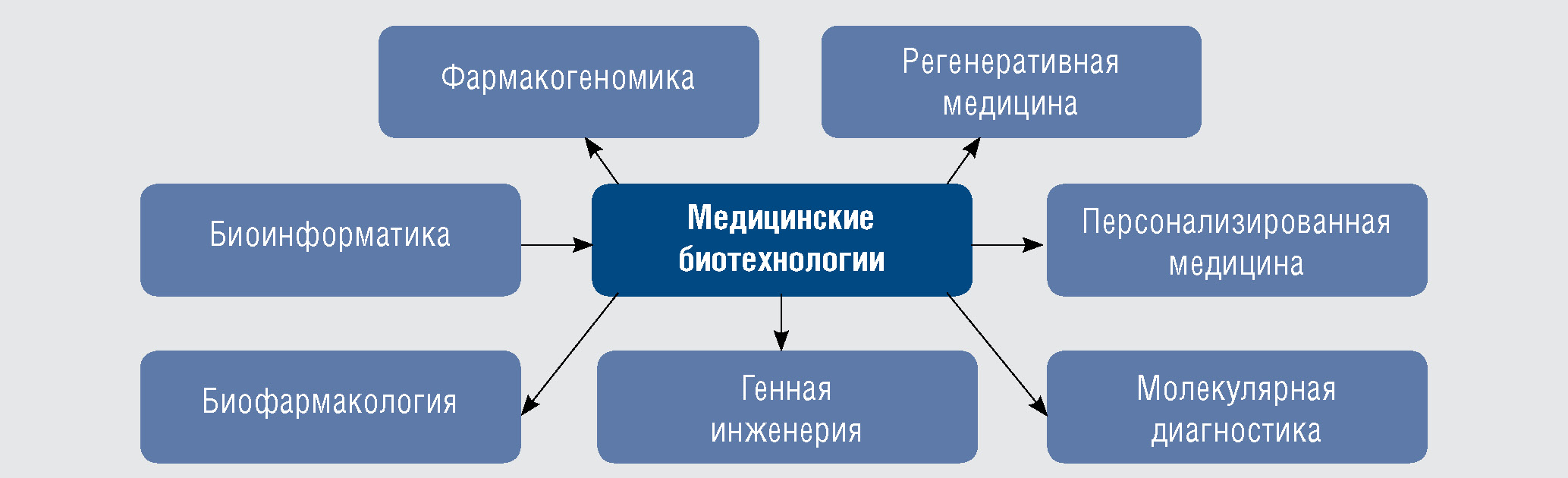 На современном этапе развития научной мысли медицина и биотехнология стали чрезвычайно часто пересекаться между собой, стремясь к предотвращению, диагностике и лечению заболеваний на самых ранних этапах. Ключевыми направлениями биотехнологии, применяемыми в медицине, являются молекулярная диагностика, генная инженерия (которую принято подразделять на такие подразделы, как генная терапия, разработка вирусных векторов, процессы клонирования/гибридизации и др.), фармакогеномика, биоинформатика, регенеративная медицина (включающая тканевую инженерию, клеточную терапию и др.), биофармакология (создание вакцин, рекомбинантного инсулина/гормонов, моноклональных антител, заместительных ферментных терапий и др.), персонализированная медицина, наномедицина (рис. 1) [1].
