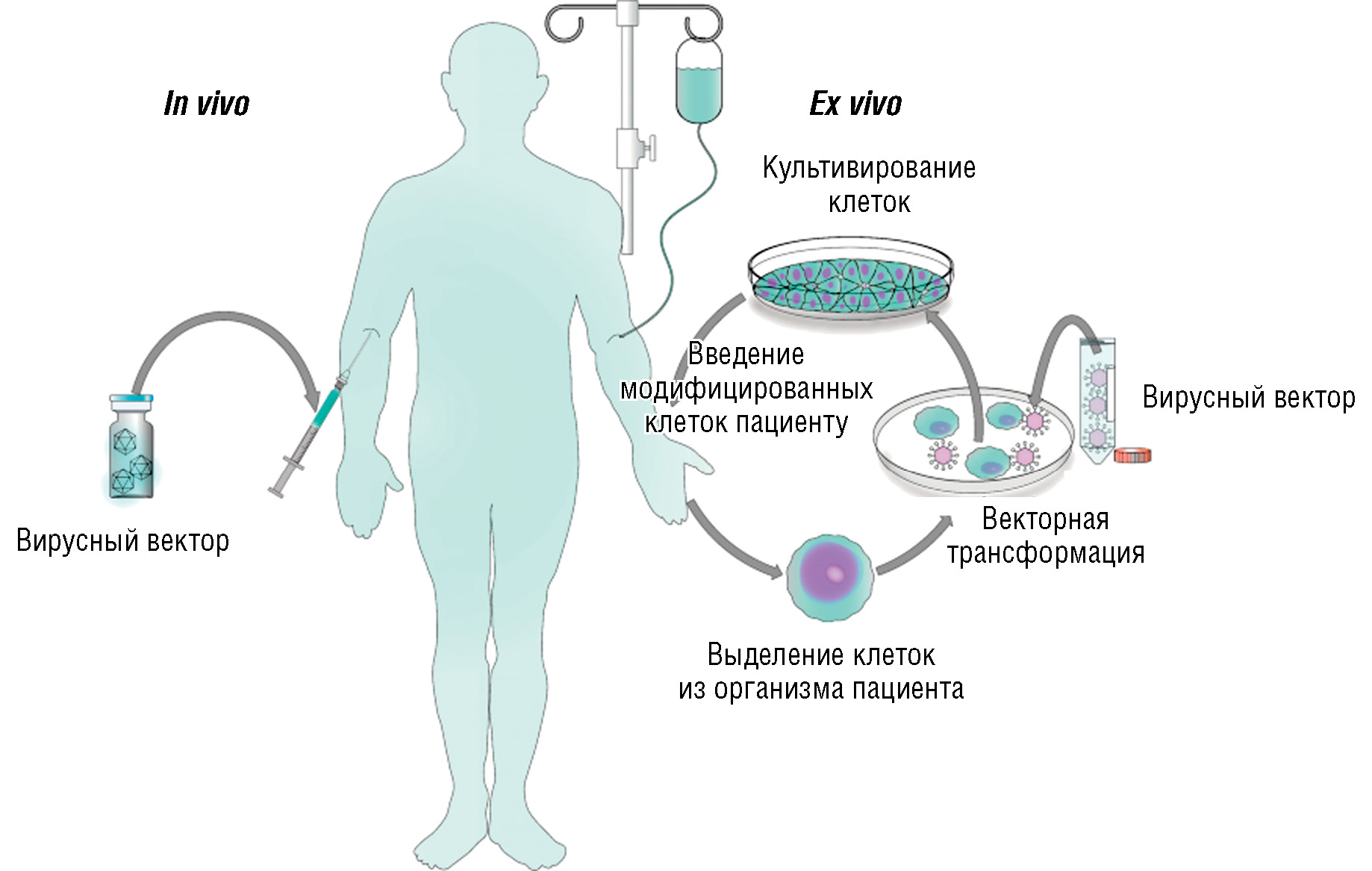 Наиболее изученным и распространенным способом введения генетического материала в клетки является доставка при помощи конструкций на основе вирусов. При более детальном рассмотрении вирусных векторов и их применения в медицине стоит отметить вклад некоторых вирусных векторов на основе таких вирусов, как ретровирусы, аденовирусы, герпесвирусы и аденоассоциированные вирусы. Вирусная система переноса генов может происходить двумя способами — in vivo и ex vivo (рис. 2)1 [2].