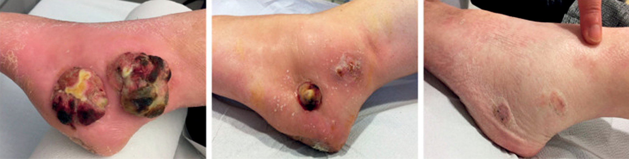 Рис. 3. Результат прохождения терапии при применении препарата IMLYGIC пациентом 62 лет, обратившимся к специалистам с двумя крупными поражениями лодыжки и метастазами в лимфатических узлах, вызванными акральной меланомой. Пациент проходил курс лечения IMLYGIC на протяжении двух лет, добившись полной ремиссии, которая также наблюдалась спустя два года после окончания терапии: а — при первичном осмотре; б — спустя 6 месяцев после назначения IMLYGIC; в — спустя 12 месяцев после назначения IMLYGIC
