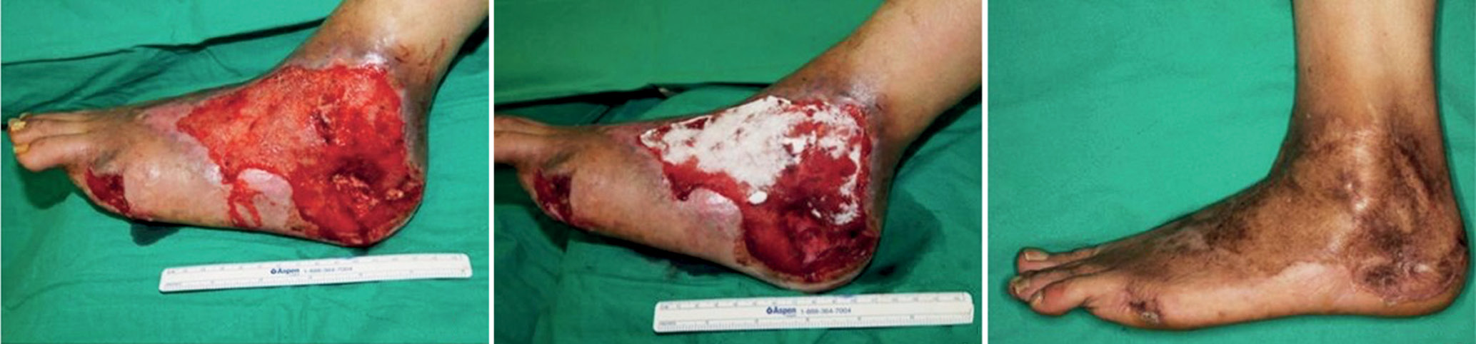 Рис. 4. Результаты терапии с использованием дермального заменителя Matriderm: а — повреждение мягких тканей стопы в результате сильного ожога; б — нанесение кожного заменителя Matriderm поверх раны после проведения санации; в — 10 месяцев после имплантации. Эстетический результат и анализ кожных покровов в месте трансплантации оцениваются как хорошие [80]