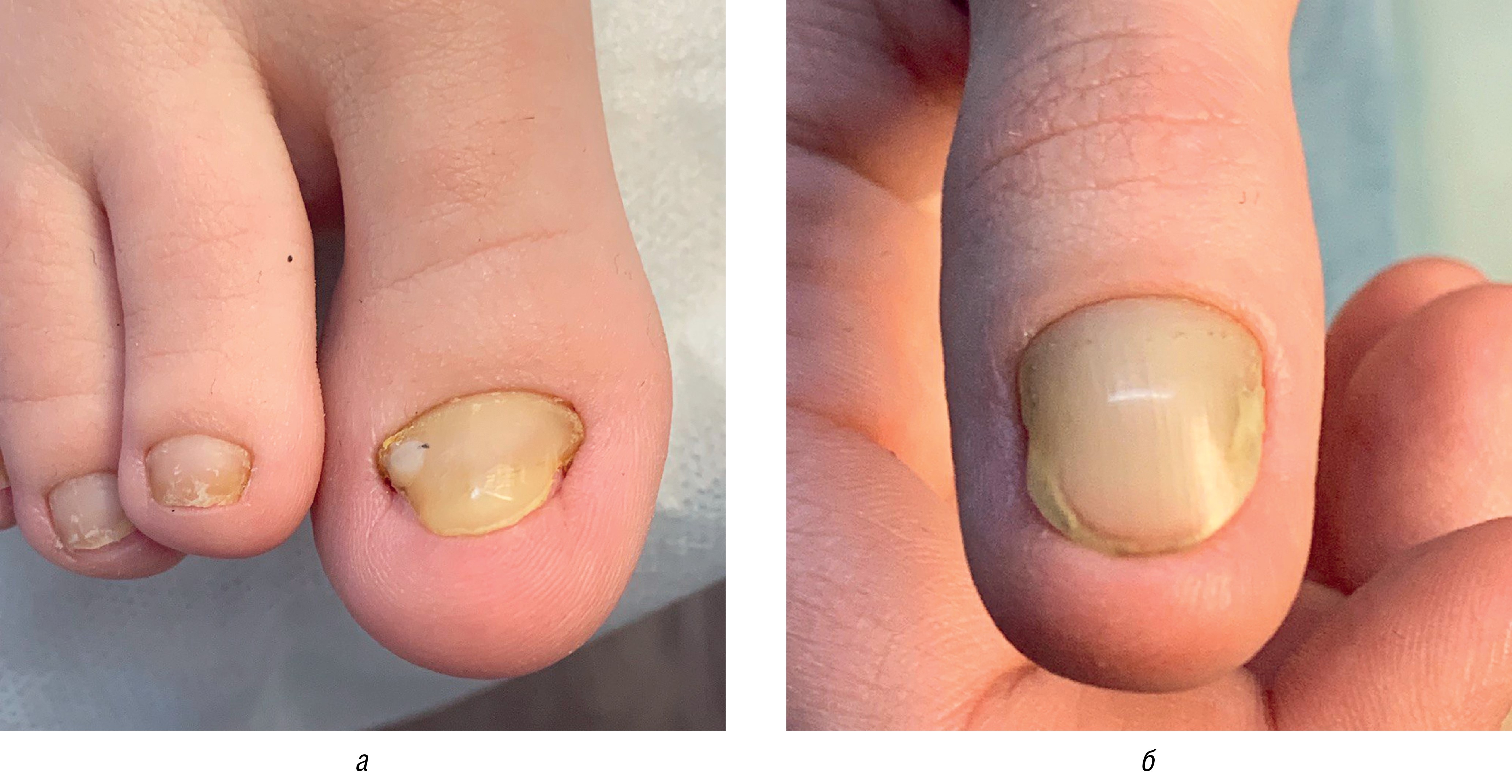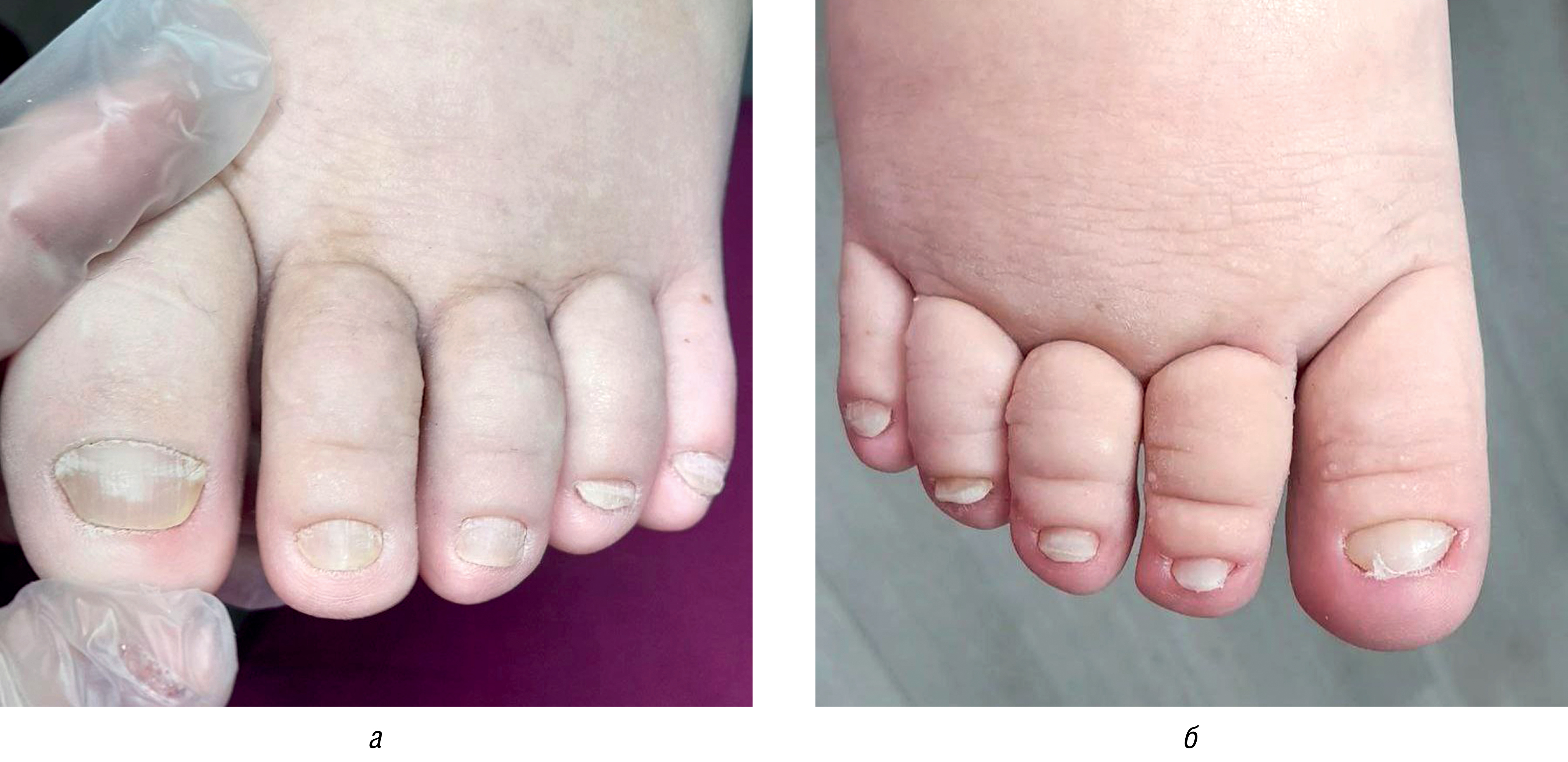 Рис. 3. Выраженное утолщение, потеря прозрачности ногтей и онихолизис у пациента с синдромом желтых ногтей: а — на правой стопе; б — на правой кисти
