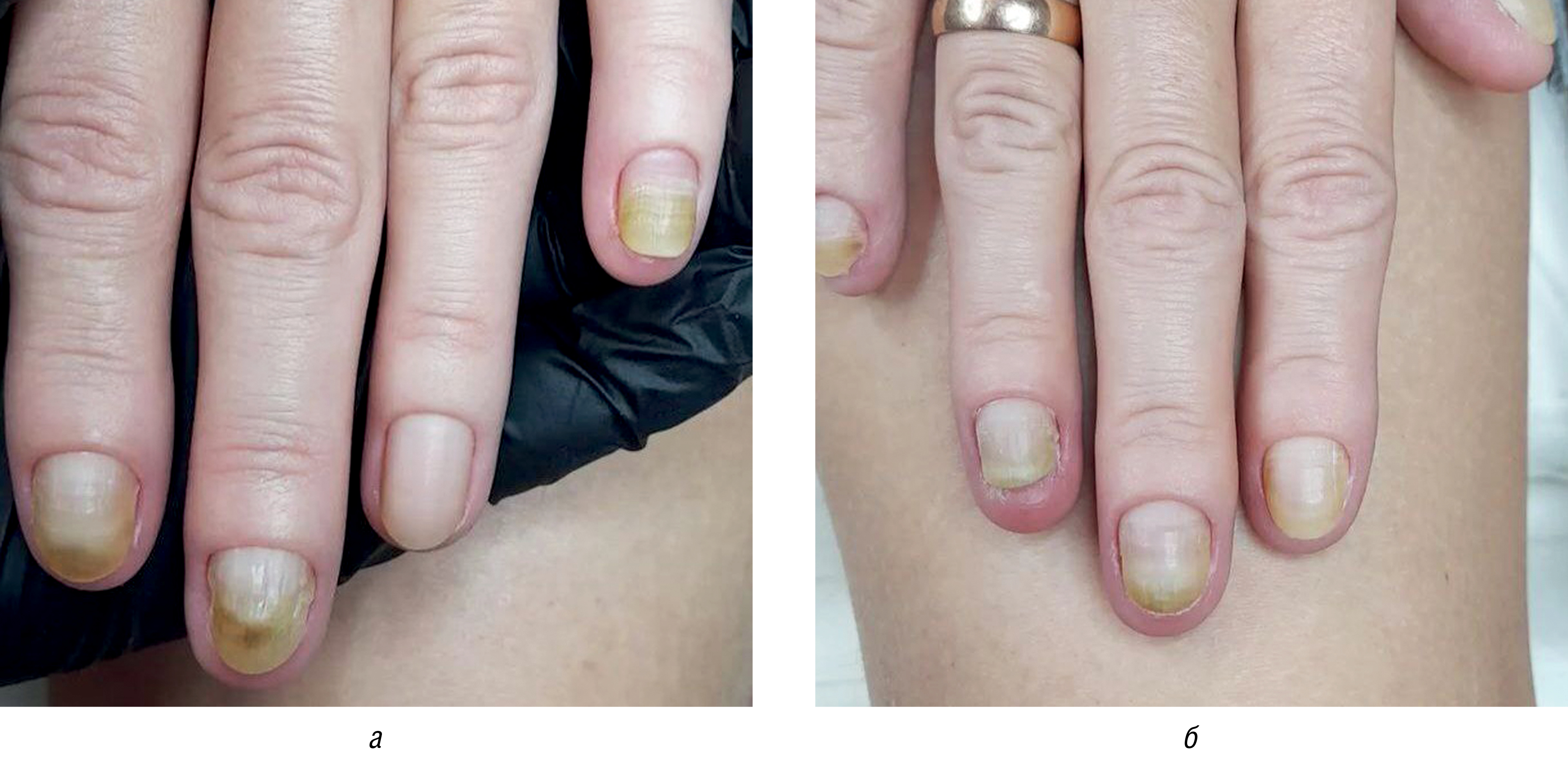Рис. 2. Ксантонихия, онихолизис, утолщение и потеря прозрачности ногтевых пластин пальцев кистей у пациента с синдромом желтых ногтей: а — левая кисть; б — правая кисть