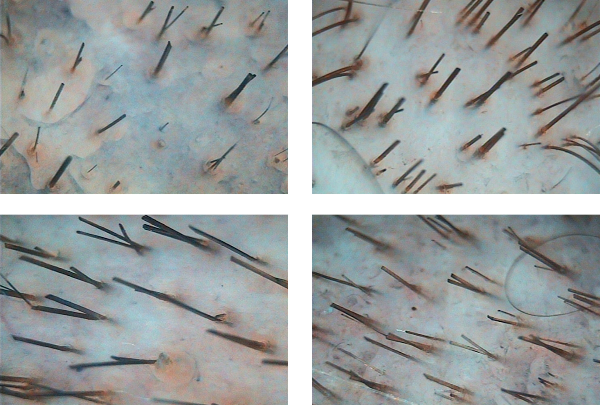 Трихографический анализ. Оценка количественных характеристик волосяного покрова проводилась на основе данных трихограммы и фототрихограммы, выполненных с использованием микрокамеры AramoSG (Aram HUVIS Co. Ltd., Республика Корея), с последующей обработкой полученных изображений профессиональной компьютерной диагностической программой Trichoscience PRO v. 1.4 (Россия). При помощи объектива × 60 на участках 0,1 ± 0,004 см² определялось количество волос в андрогензависимой (теменной) и андрогеннезависимой (затылочной) зонах. Измерение диаметра стержней волос проводилось с помощью объектива × 200. Перед проведением фототрихограммы выполнялось подбривание волос на длину 0,2–0,3 мм на участках площадью 8–10 мм2 в теменной и затылочной зонах, после чего через 48 ч на них наносился красящий состав IgoraBonacrom черного цвета (Schwartzkopf, Германия). После 10-минутной экспозиции краситель смывался спиртосодержащим средством, а прокрашенные участки анализировались с помощью объектива × 60. Подсчет количества волос на 1 см² осуществлялся автоматически.