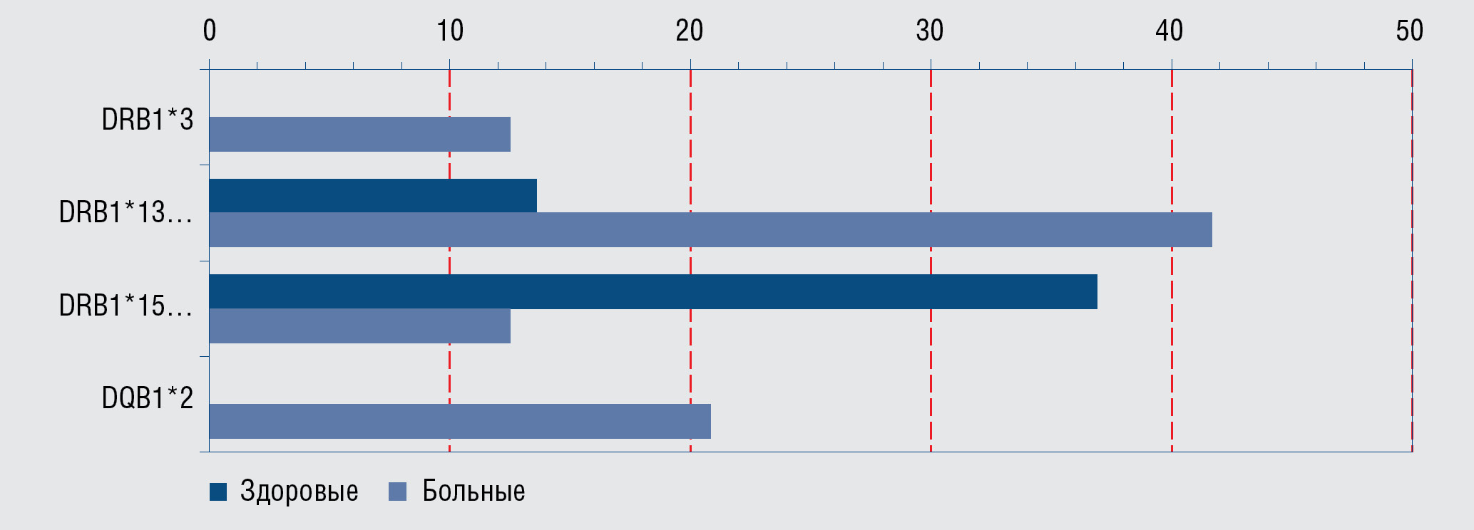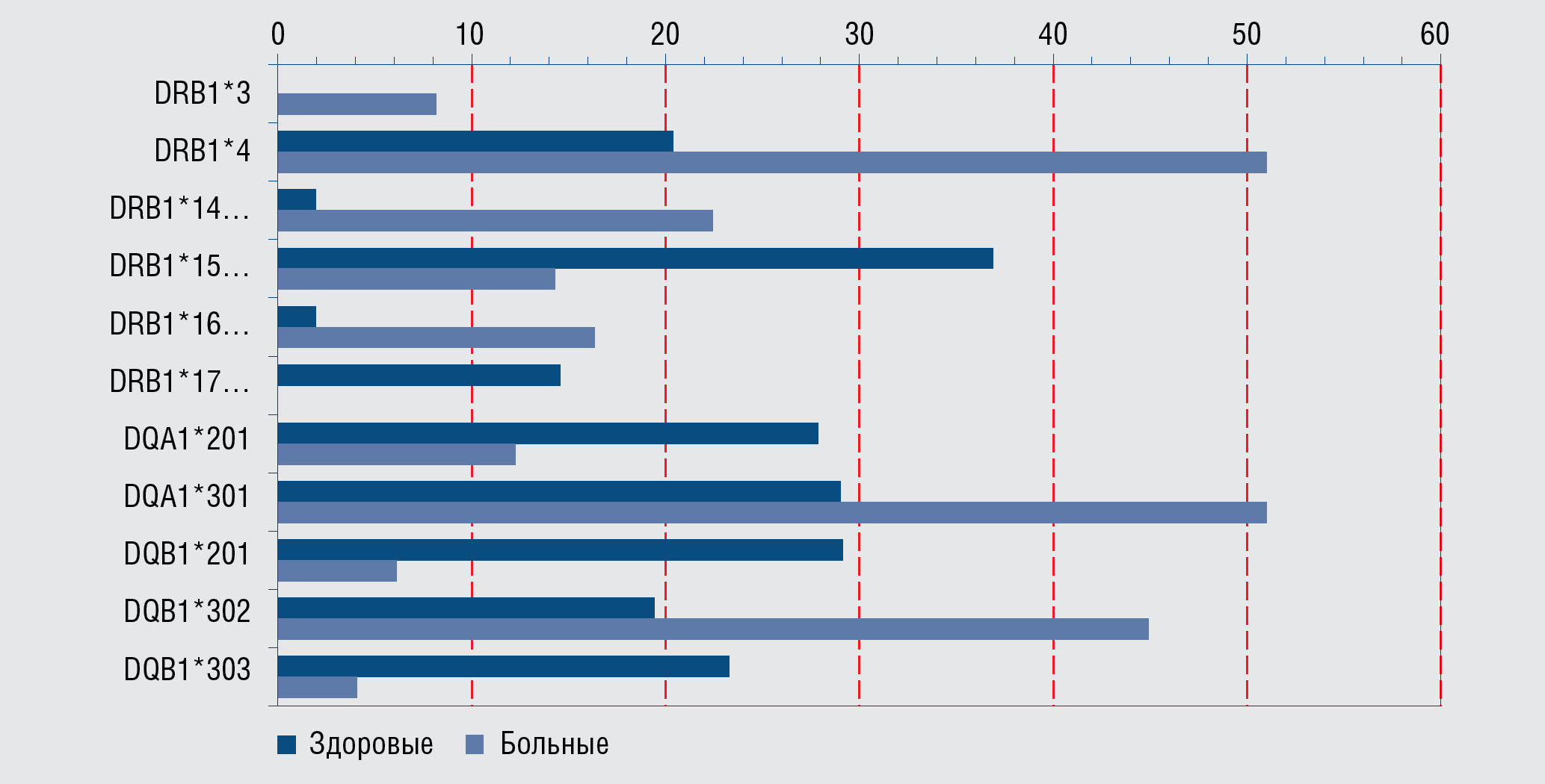 DQB1*301 DQB1*304 DQB1*402 | 3,16 20,29 20,29 | 0,01 < 0,05 < 0,05 | DQB1*602-8 DQА1*0103 | < 0,01 < 0,01 | |