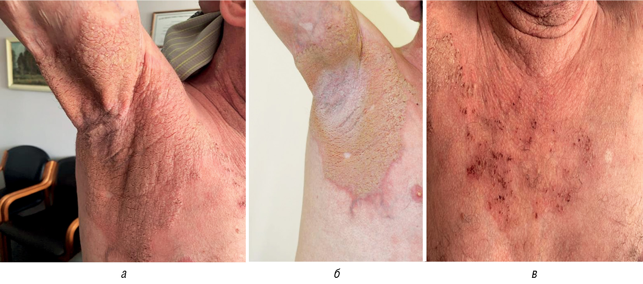 Fig. 4. Patient Ya., 32 years old, suffering from benign chronic BFP in 8 years. Lesions in the axillary regions, the left inframammary region, on the anterior abdominal wall (a). The pathological process is presented before (б) and after 3 months of therapy with apremilast (в). The spread of the pathological process to previously unaffected skin in the chest area is noted, the lack of effect in previously affected areas