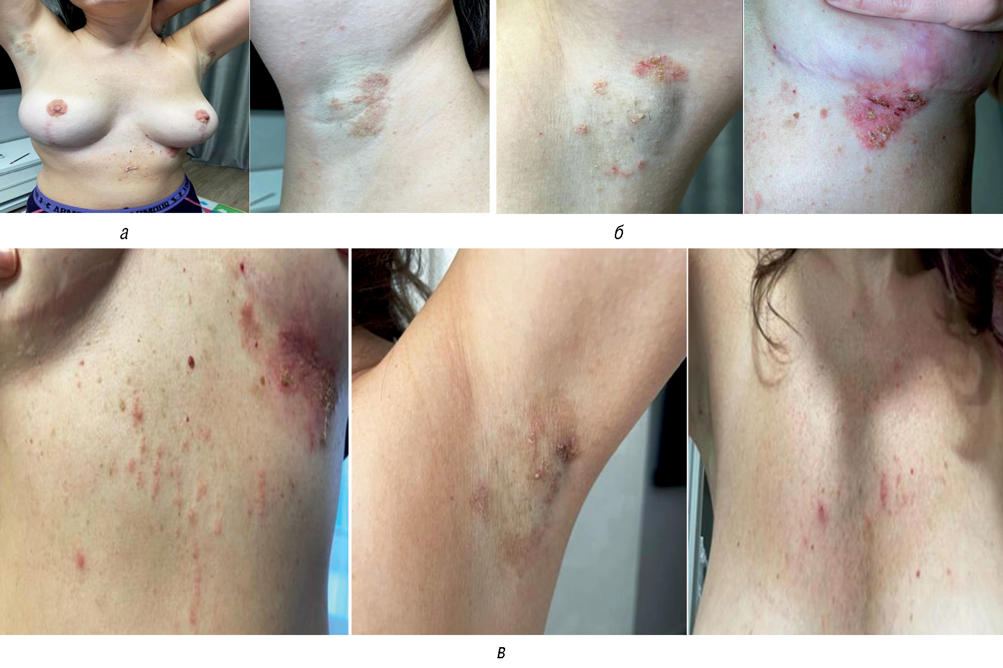 Рис. 4. Пациентка Я., 32 года, страдающая ДСП в течение 8 лет. Очаги поражения в аксиллярных областях, левой инфрамаммарной области, на передней брюшной стенке (а). Представлен патологический процесс до (б) и спустя 3 месяца терапии апремиластом (в). Отмечается распространение патологического процесса на ранее непораженную кожу в области груди, отсутствие эффекта на первоначально пораженных участках