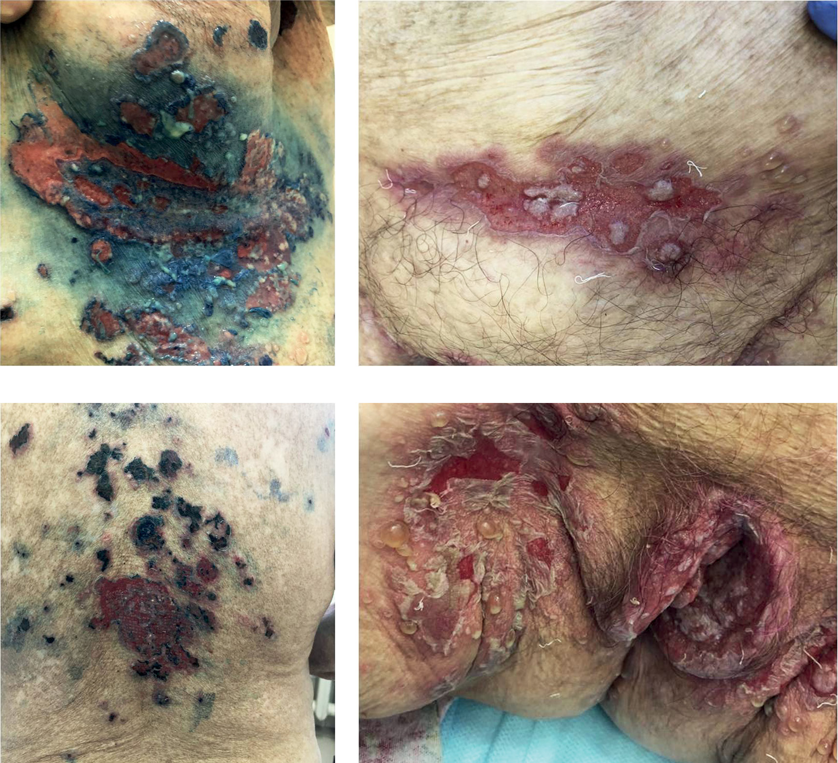 При поступлении высыпания локализовались на коже заушной области, туловища, верхних и нижних конечностей, в аногенитальной области, паховых и субмаммарных складках, а также на слизистой оболочке полости рта в виде полиморфных высыпаний. Как на видимо здоровой коже, так и на отечном гиперемированном основании отмечались везикуло-буллезная сыпь, пузыри с плотной или вялой покрышкой, с серозным или серозно-гнойным содержимым. На коже заушной области, субмаммарных складок (рис. 1, а), нижней трети живота (рис. 1, б), спины (рис. 1, в) и паховых складок (рис. 1, г) определялись мокнущие эрозии ярко-красного цвета с гнойным отделяемым.