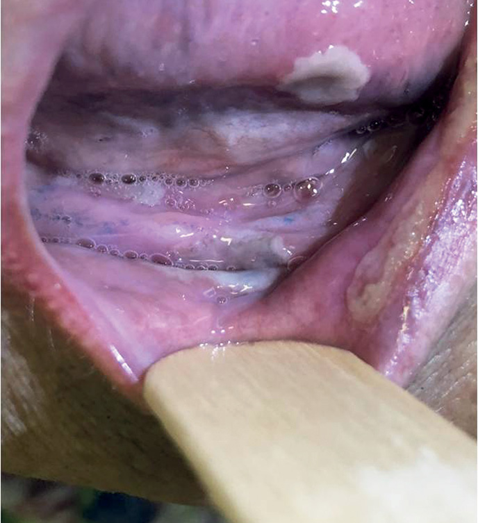 Fig. 2. Oral mucosa lesion in the form of multiple erosions and fibrinous plaque on the background of hypersalivation