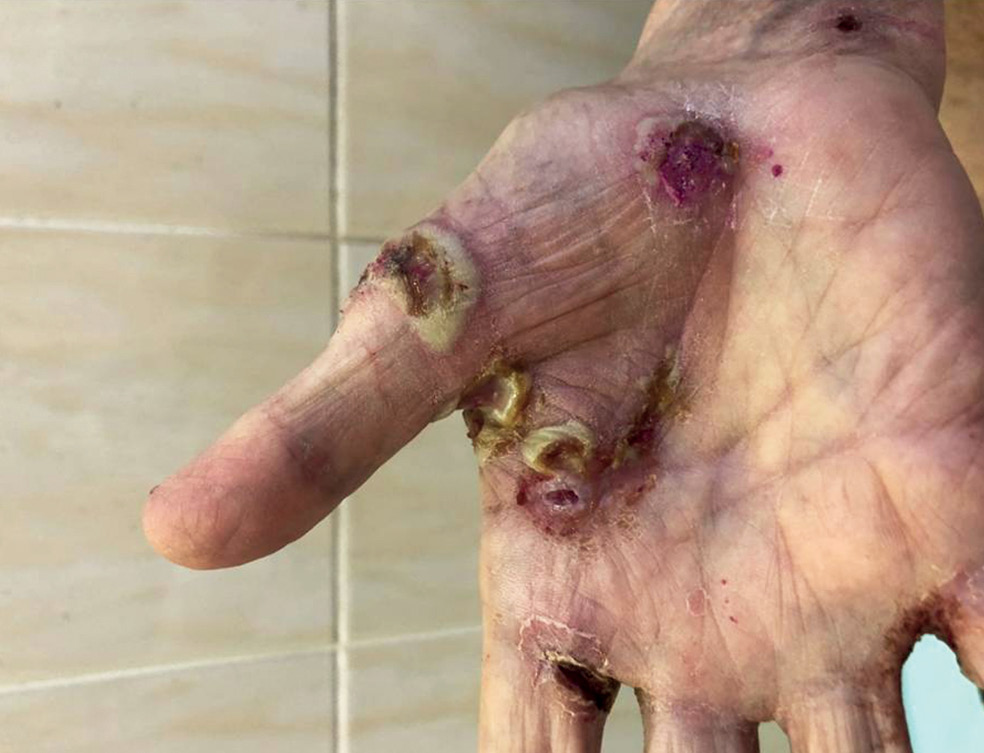 Рис. 3. Эрозивно-язвенные дефекты, окруженные гнойным валиком, на ладонной поверхности правой кисти (до лечения).