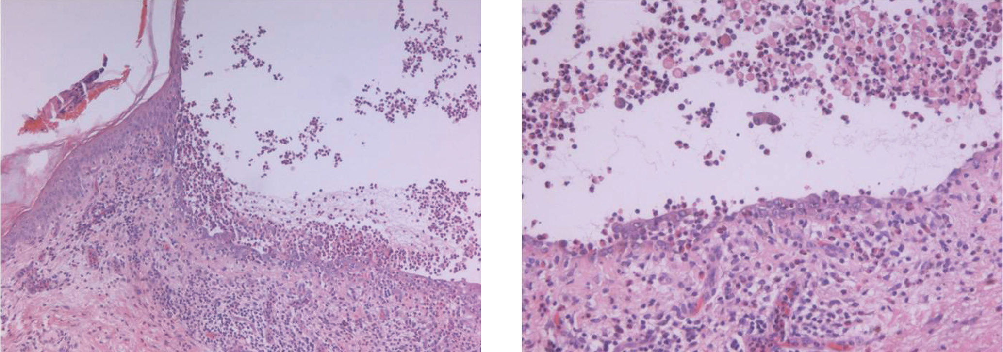 При цитологическом исследовании со дна эрозий обнаружены акантолитические клетки. При гистологическом исследовании определялся крупный супрабазальный пузырь с признаками эпителизации в дне пузыря, в просвете пузыря — разрозненные акантолитические клетки и их пласты, нити фибрина, эозинофильные и нейтрофильные гранулоциты (рис. 4).