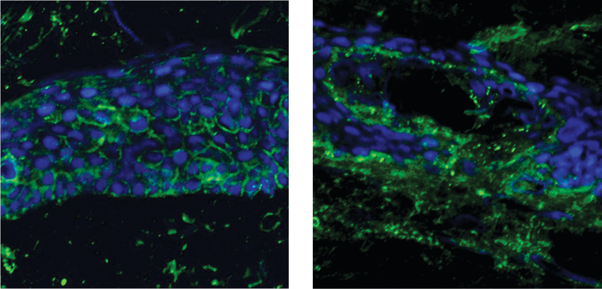 Рис. 5. Исследование реакции иммунофлуоресценции с антителами к IgG, IgA, IgM в биоптате видимо непораженной кожи: а — отчетливая фиксация IgA, в чуть меньшей степени — IgG в межклеточных промежутках всех слоев эпидермиса (в виде «сетки»); б — фиксация IgM в виде неярко выраженной прерывистой линии вдоль дермо-эпидермальной границы