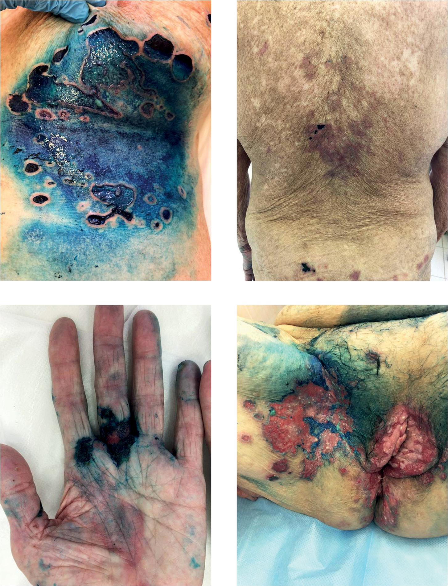 Пациентка выписана с положительным эффектом в виде уменьшения гнойного отделяемого, прекращения появления новых пузырей, эпителизации большей части эрозий на коже заушной области, паховых и субмаммарных складок (рис. 6, а), спины (рис. 6, б), верхних и нижних конечностей, в том числе кистей (на ладонной поверхности левой кисти сохранялась эритема в виде «мишени») (рис. 6, в), аногенитальной области (рис. 6, г), а также на слизистой оболочке полости рта.