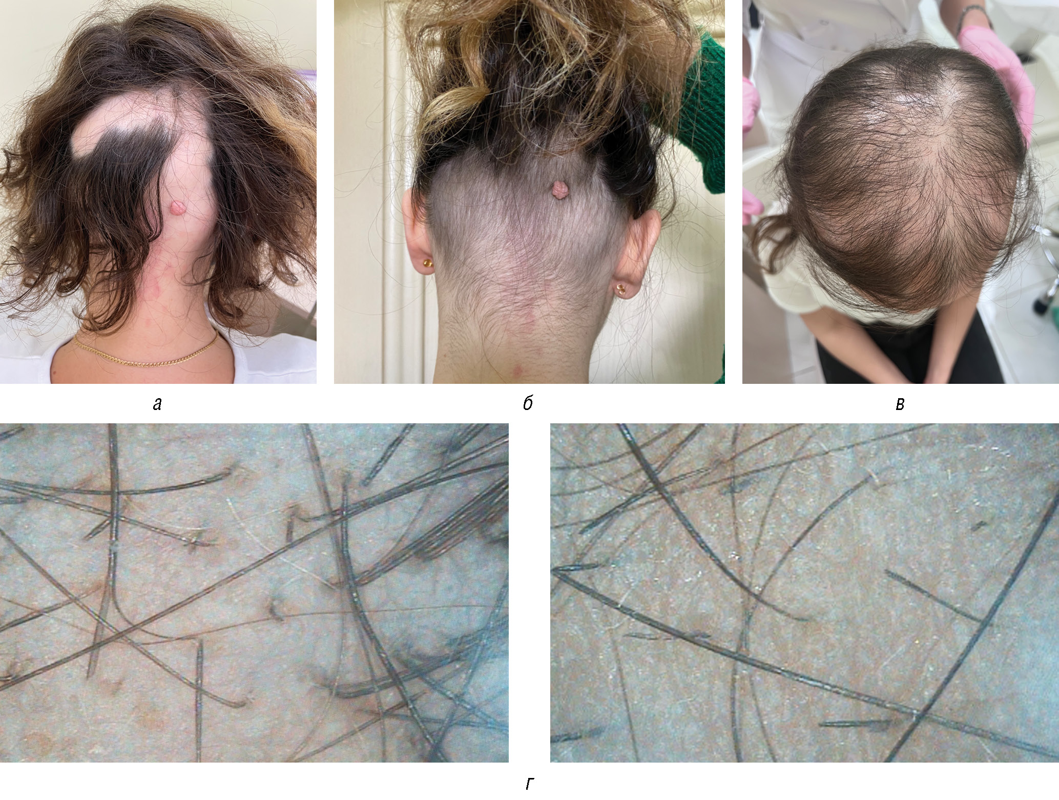 Рис. 1. Пациентка 28 лет, диагноз «гнездная алопеция, тяжелая форма»: а — до начала терапии; б — через 1,5 месяца терапии; в — через 12 недель терапии; г — трихоскопия («обломанные волосы», «черные точки», «желтые точки», «восклицательные знаки») через 12 недель