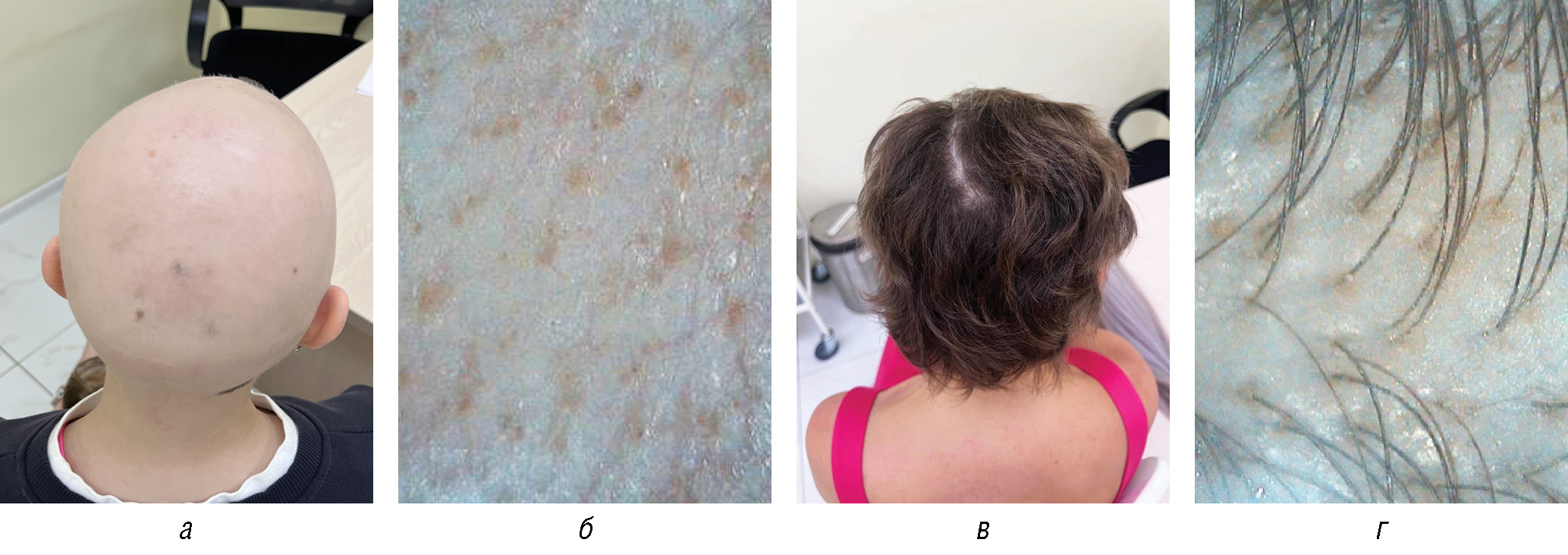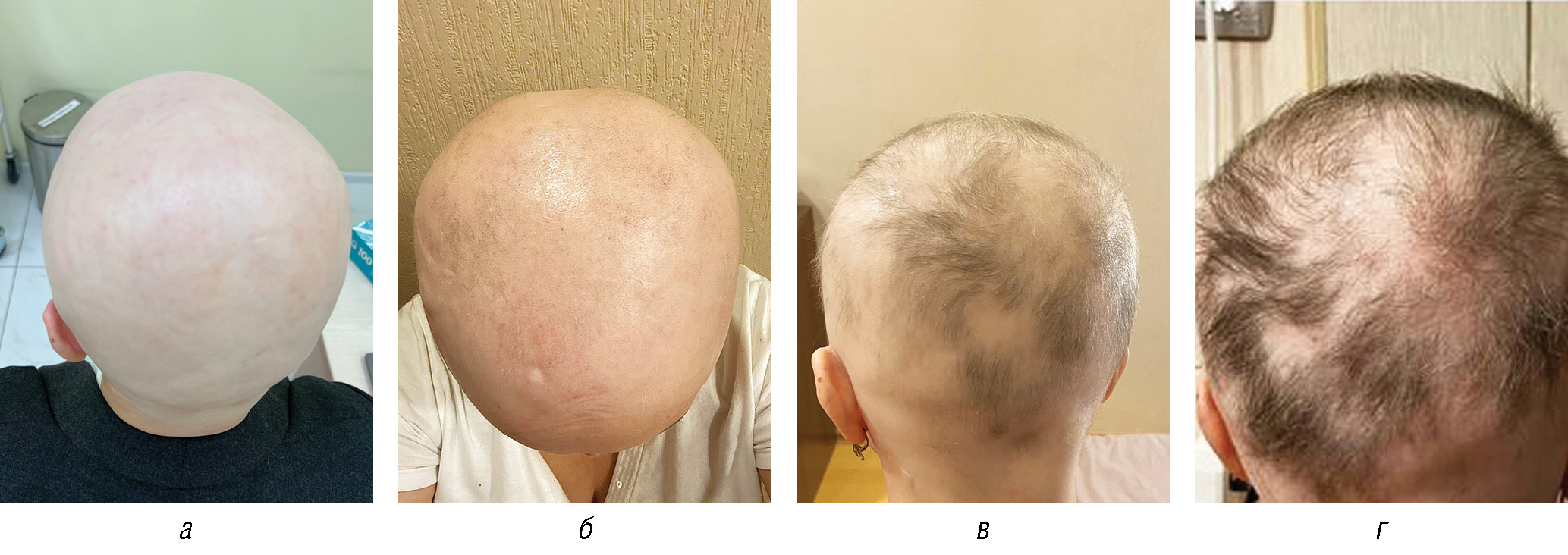 Рис. 3. Пациентка 52 лет, диагноз «универсальная алопеция»: а — до начала терапии; б — через 2 месяца терапии; в — через 3 месяца терапии; г — через 4 месяца терапии