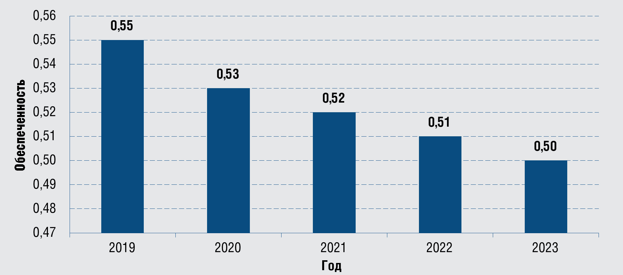 Обеспеченность населения РФ врачами-дерматовенерологами в 2023 г. находится на уровне 0, 5. Динамика показателя за пятилетний период представлена на рис. 2 [1–4].