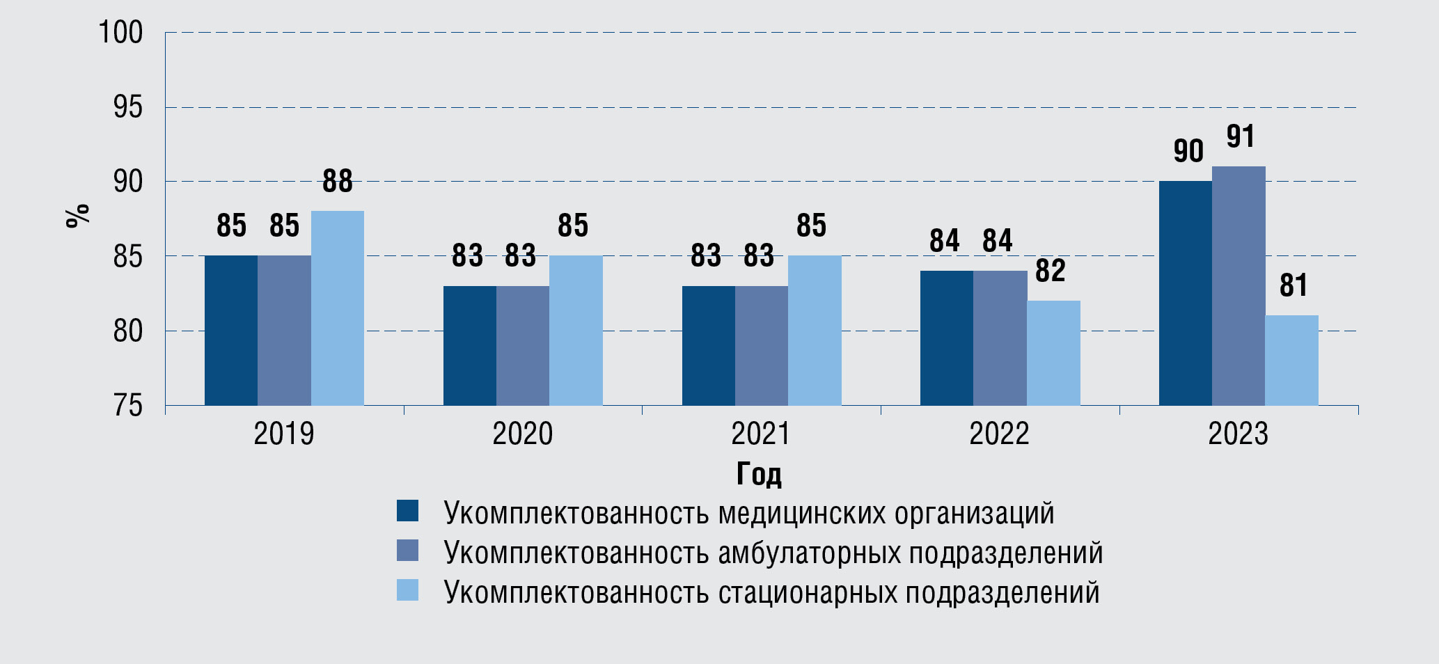 Рис. 3. Укомплектованность врачами-дерматовенерологами медицинских организаций и их подразделений, Российская Федерация, 2019–2023 гг., %