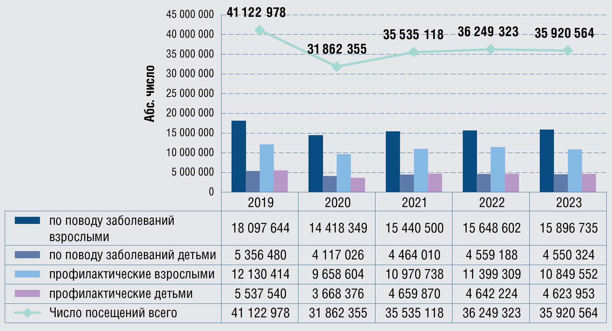 - снизилось общее число посещений врачей-дерматовенерологов, преимущественно в результате сокращения числа профилактических посещений взрослыми. Объемы медицинской помощи по профилю «дерматовенерология», оказанной в 2023 г. в амбулаторных условиях, по-прежнему не достигают доковидного уровня (2019 г.);