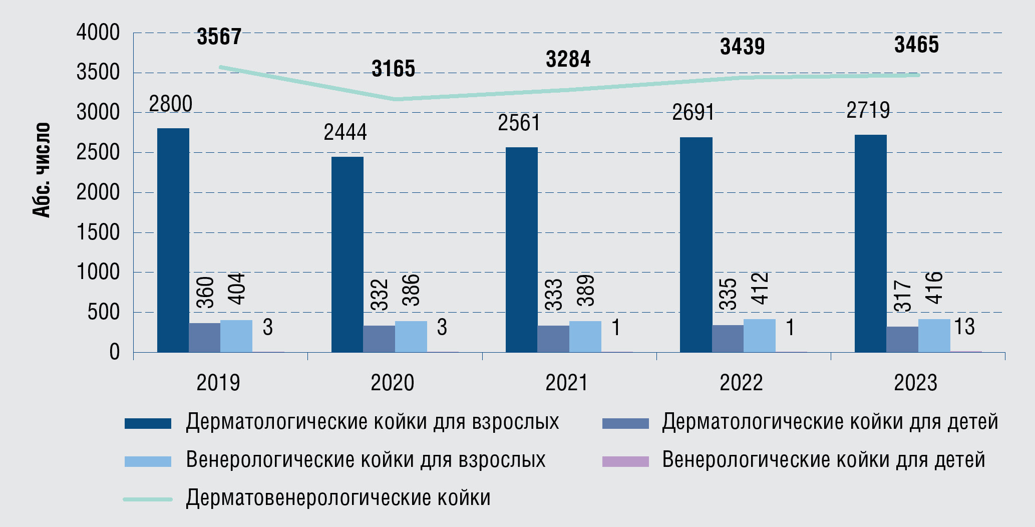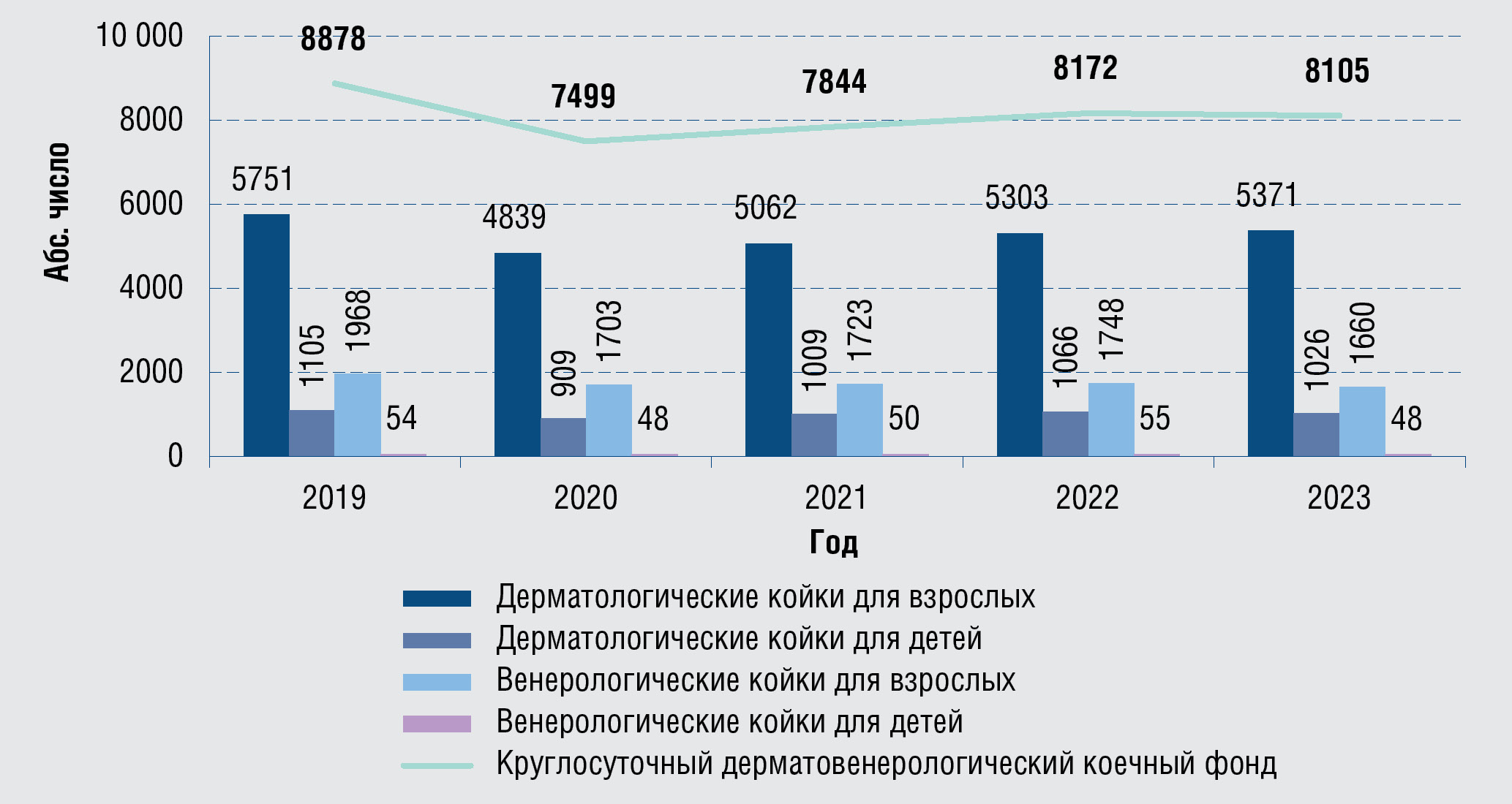 В 2023 г. в Российской Федерации (РФ) произошло сокращение числа кожно-венерологических диспансеров. В результате реорганизации, проведенной в двух субъектах РФ — Владимирской и Московской областях, число кожно-венерологических диспансеров сократилось на 16 и составило на конец года 98. Число дерматовенерологических отделений и кабинетов по сравнению с предыдущим годом существенных изменений не претерпело: число отделений уменьшилось на 1, составив 103, число кабинетов уменьшилось на 26, составив 2977 [1, 2].