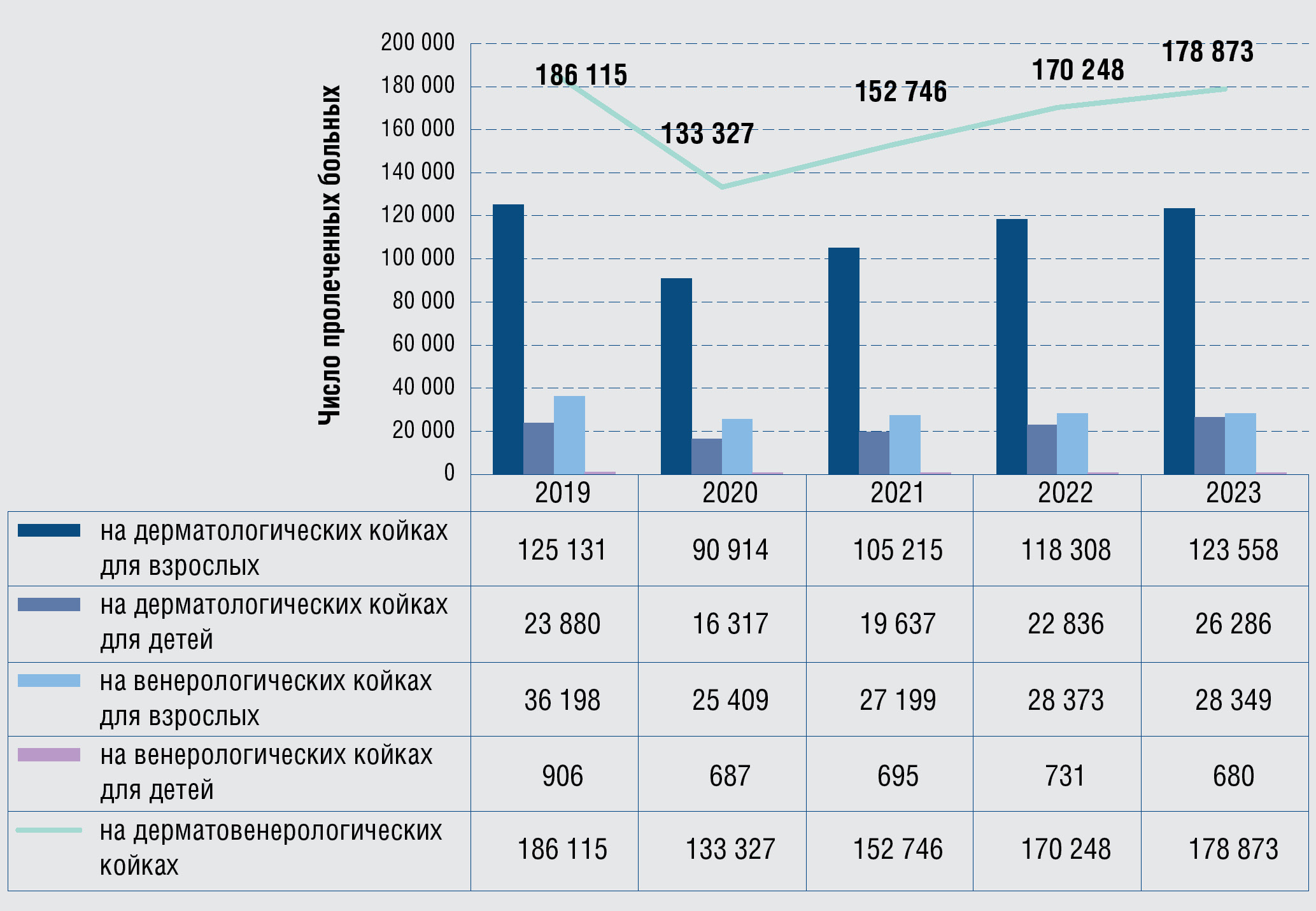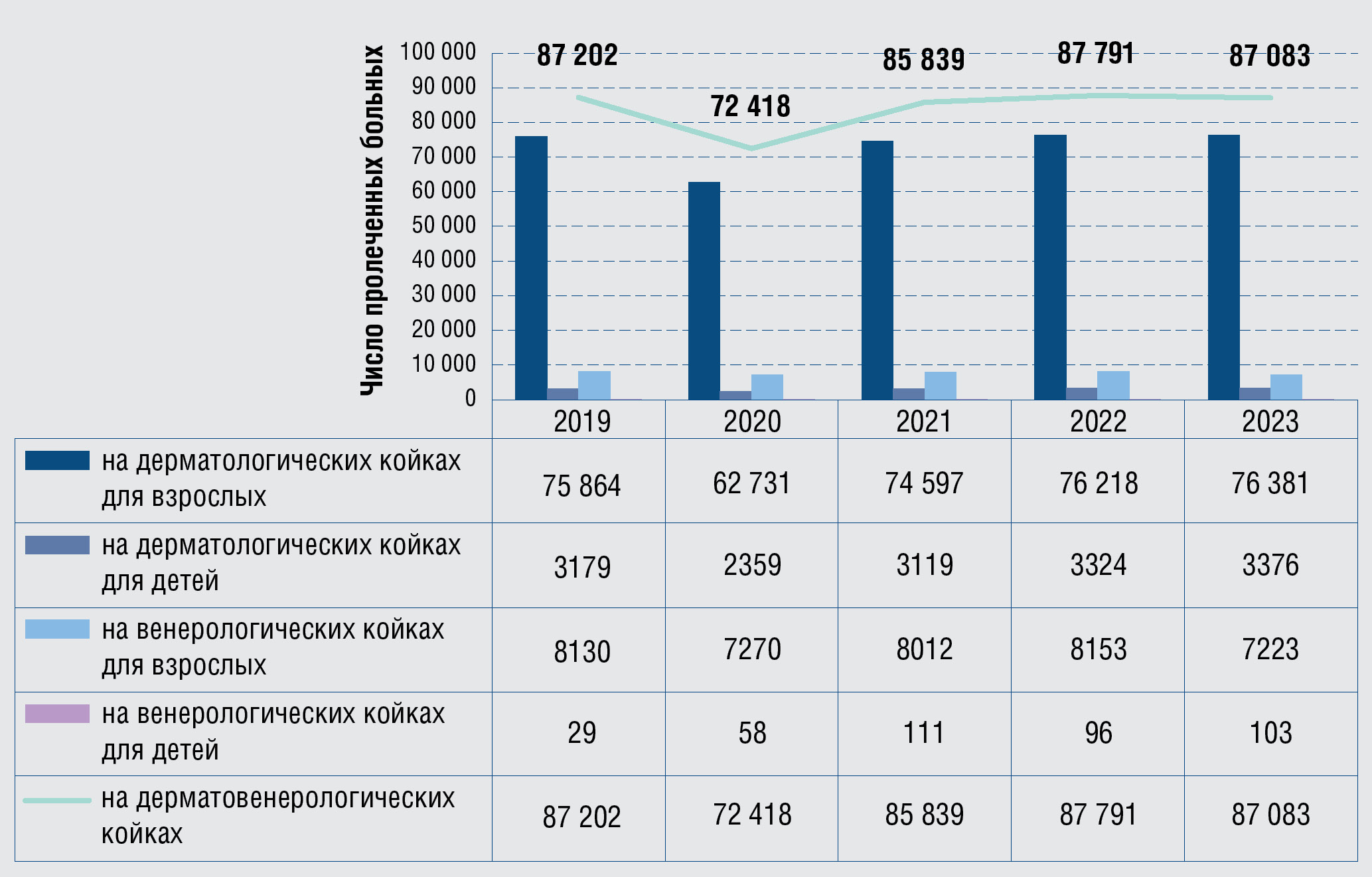 The article presents information on dynamics of dermatovenerological service resources, indicators of the population of the Russian Federation provision with dermatovenerologists and dermatovenerological beds, main performance rates and results of dermatovenereological medical care providing in outpatient, inpatient and day hospital conditions for the period 2019–2023. The dynamics of sexually transmitted infections (syphilis, gonococcal infection, trichomoniasis, chlamydial infection, anogenital herpetic viral infection and anogenital venereal warts) incidence in the Russian Federation, as well as contribution of foreign citizens to the syphilis incidence rates are analyzed. The dynamics of prevalence and incidence rates of diseases of the skin and subcutaneous tissue in the Russian Federation in 2019–2023, as well as dynamics of prevalence and incidence of atopic dermatitis, psoriasis, contact dermatitis, localized scleroderma, discoid lupus erythematosus among children aged 0–17 years and adults 18 years and older are presented.