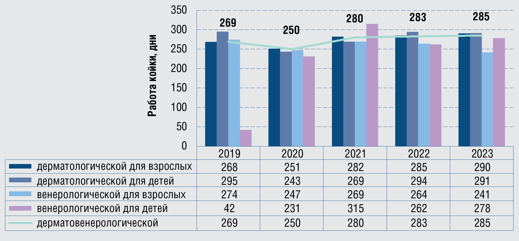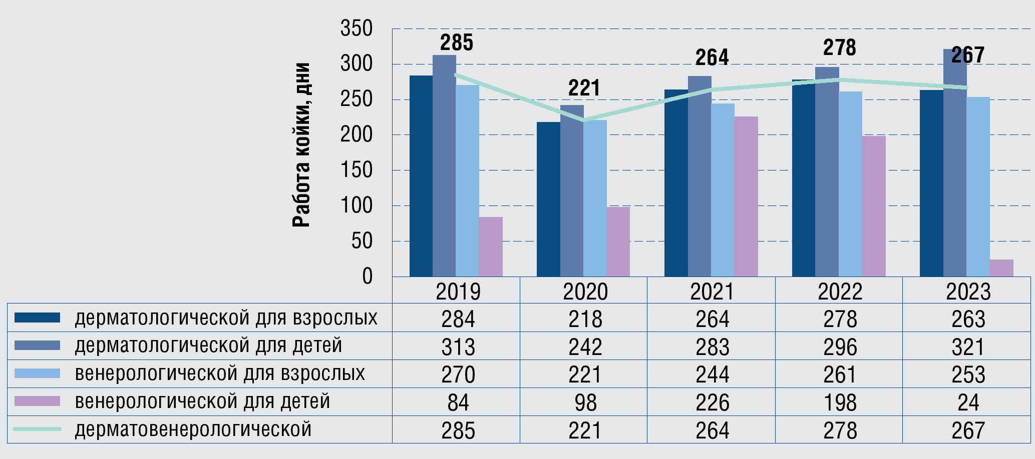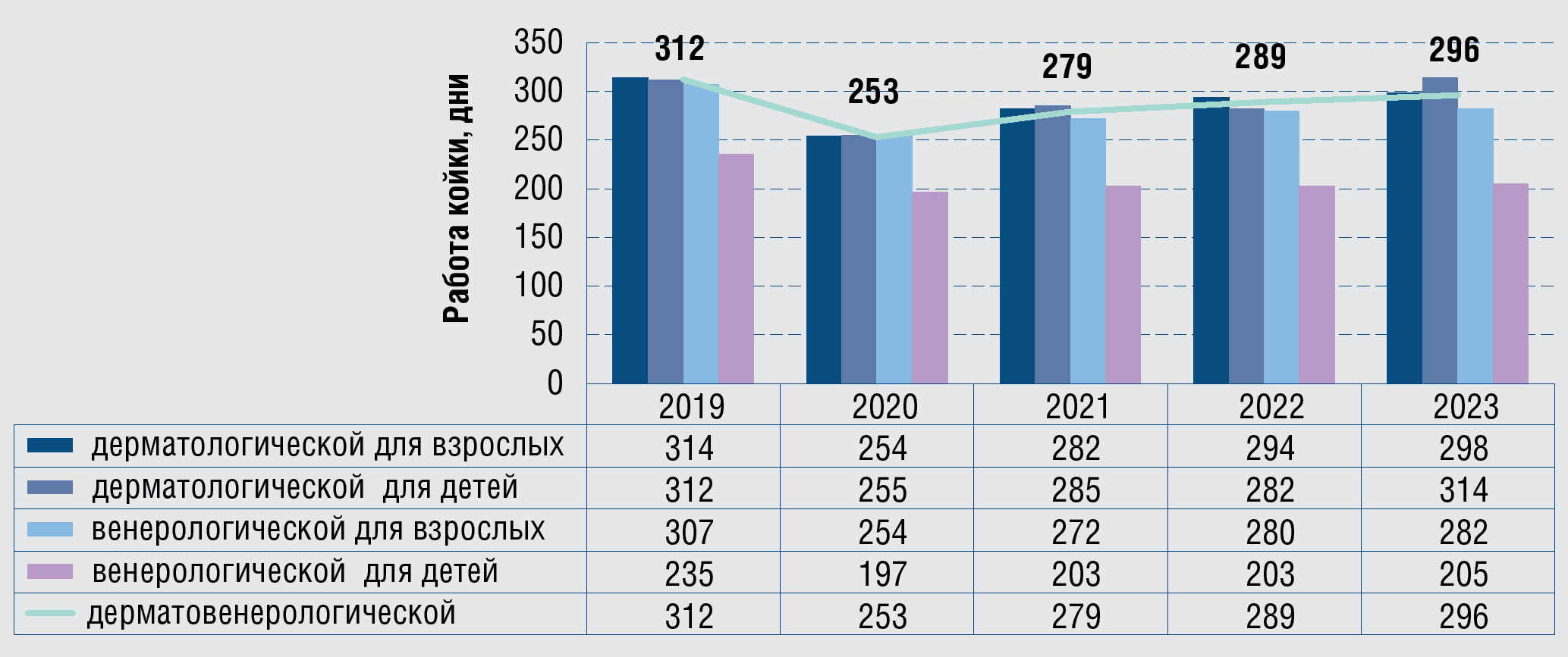 Рис. 10. Работа дерматовенерологической койки дневных стационаров медицинских организаций, оказывающих медицинскую помощь в стационарных условиях, Российская Федерация, 2019–2023 гг.